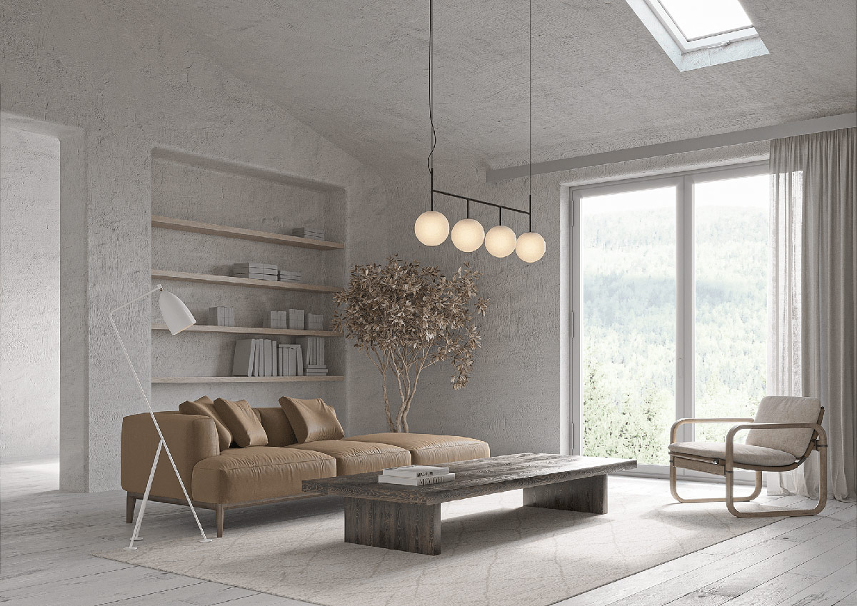 別致的白色落地燈與房間的色彩輕輕融合,而客廳的吊燈則帶有鮮明的黑色調。