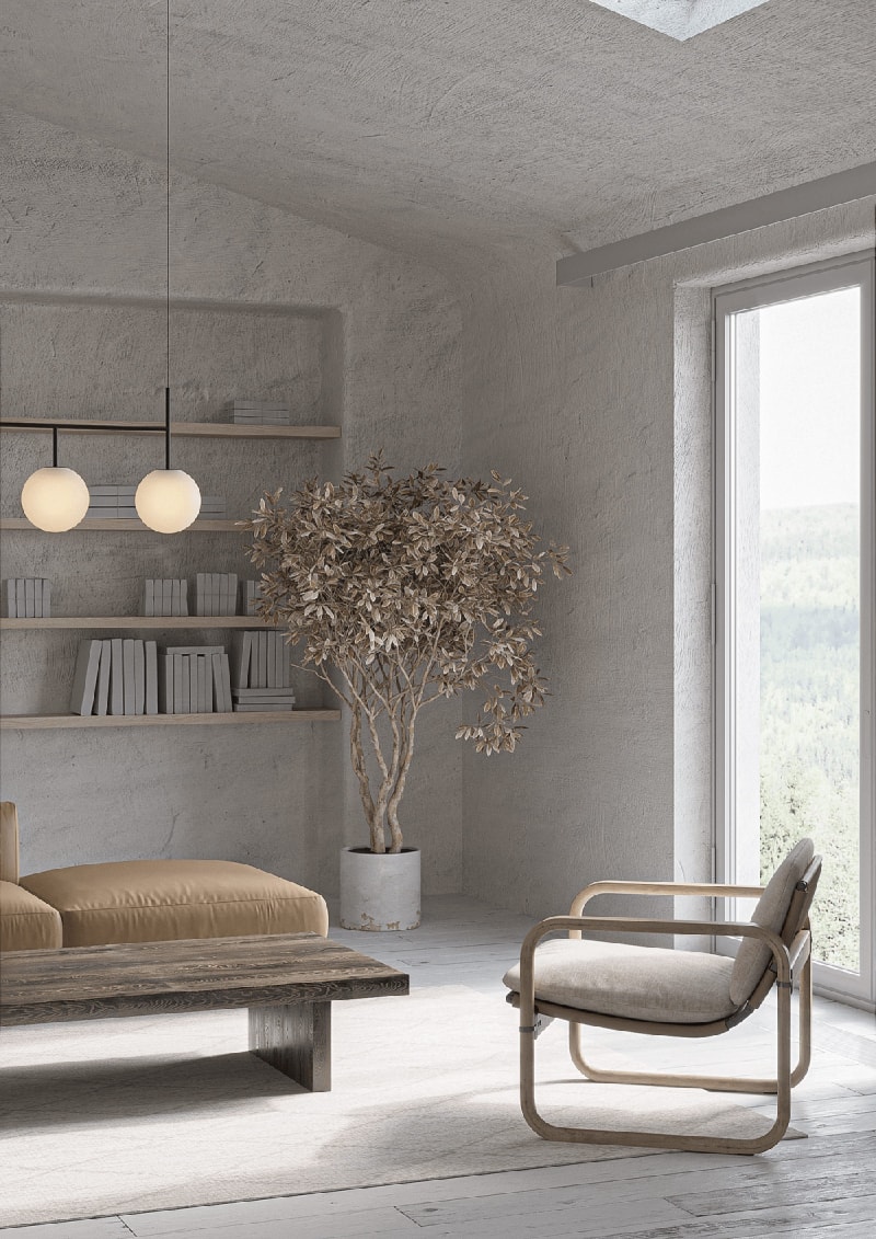 元素都來自米色、灰色、柔和的棕色和木色調的柔和、樸實的調色板,這使得紋理成為重要的。