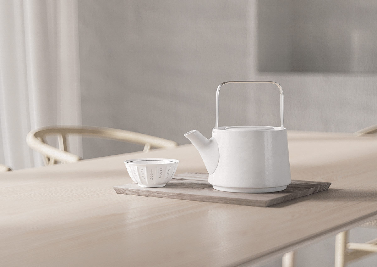 在桌子上,獨特的現代茶壺設計與其不尋常的環境相得益彰。