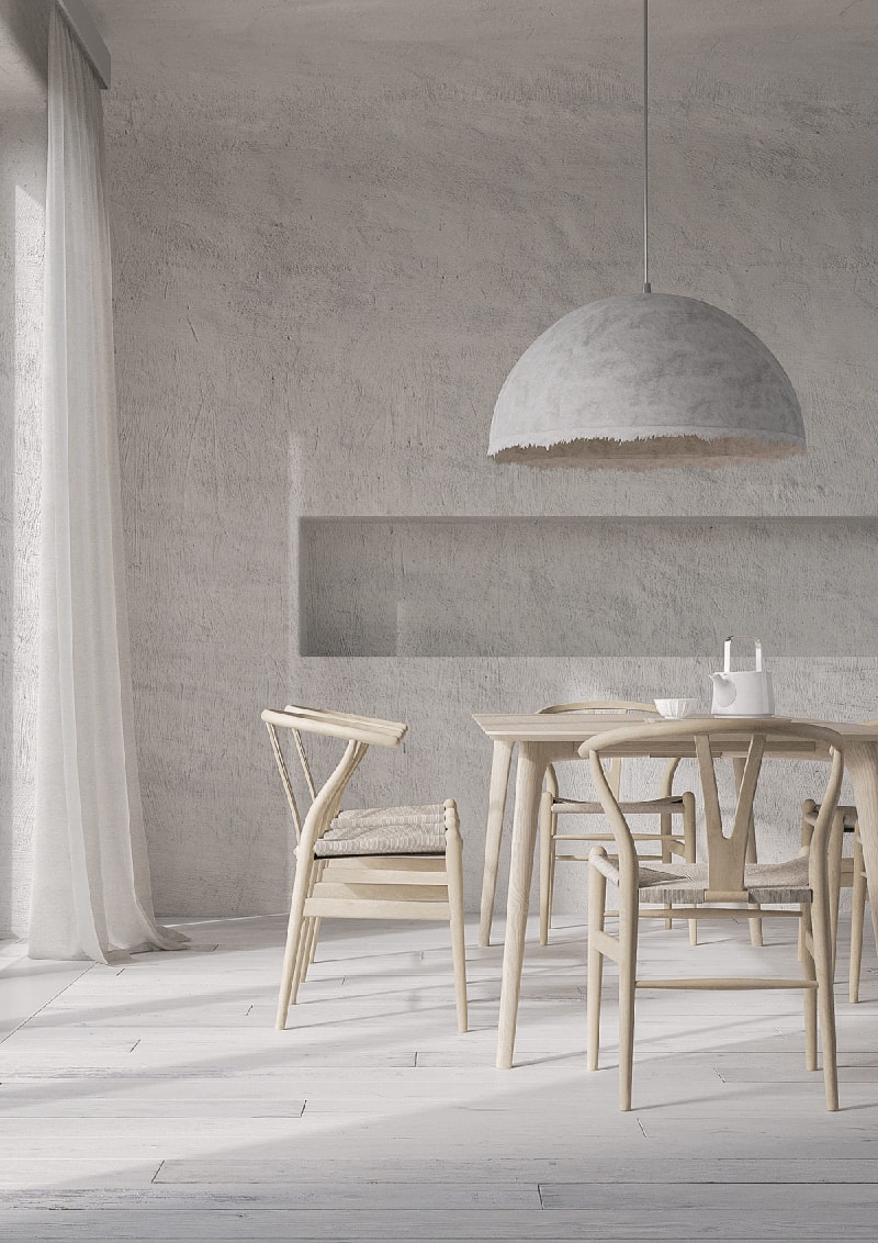 定制的餐廳吊燈經過精心設計,以復制觸覺墻壁渲染的紋理效果。這件作品在 Scandi 風格的餐桌上創造了一個引人注目的圓頂。
