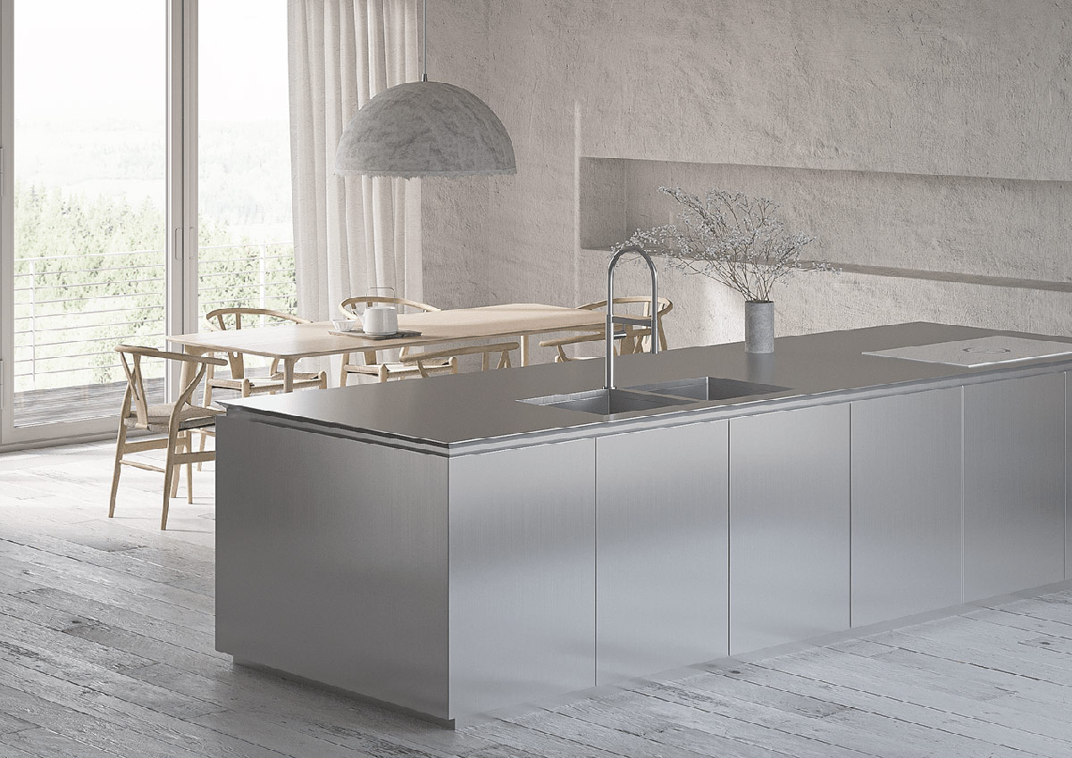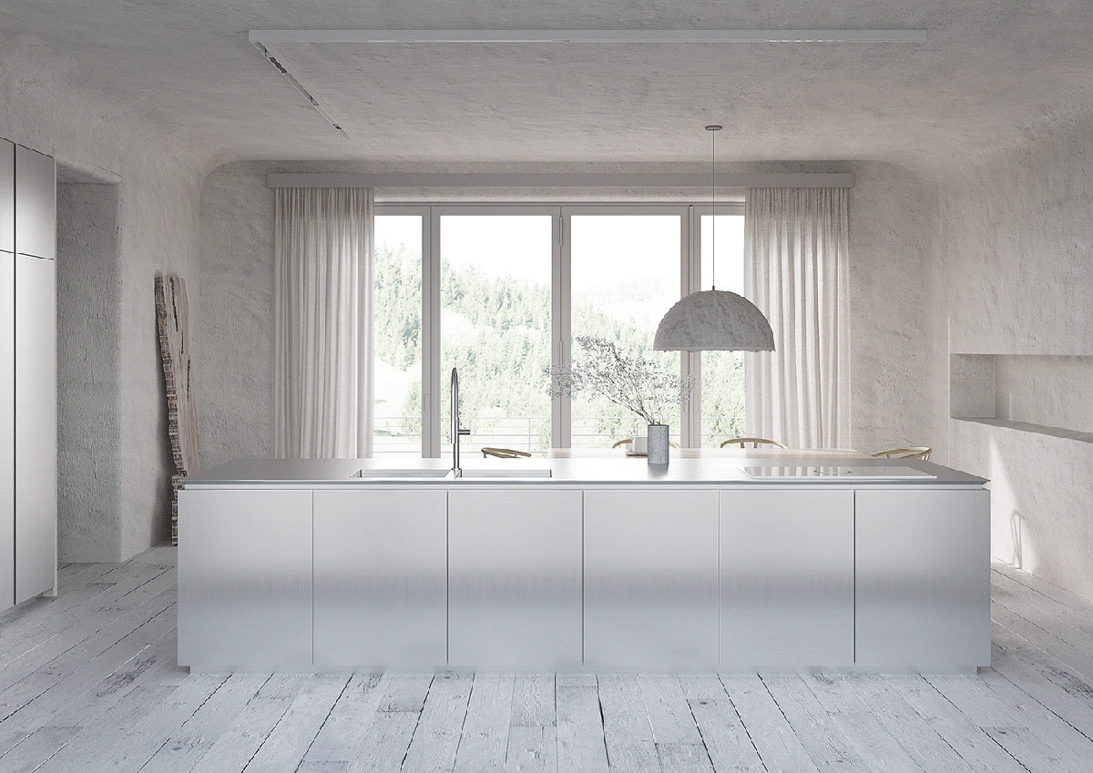 由于缺乏額外的臺面空間,廚房水槽和帶有集成抽油煙機的電磁爐都嵌入了長長的廚房島臺中。集成烤箱安裝在廚房門旁的全高單元中。