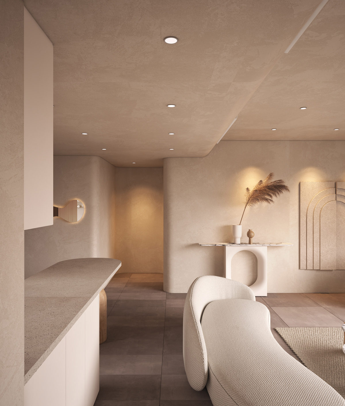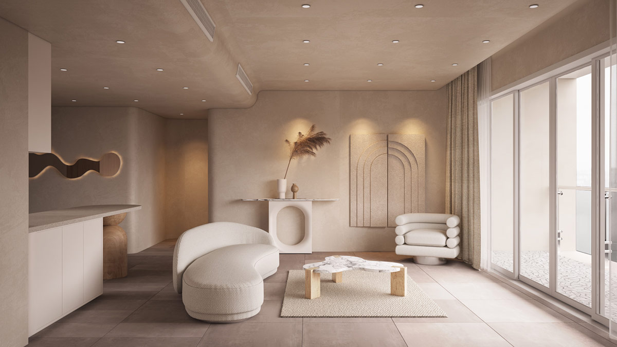 外露的石膏撫平了我們第二個特色家居內部的曲線,并輔以拱形裝飾和溫馨的弧形沙發設計。