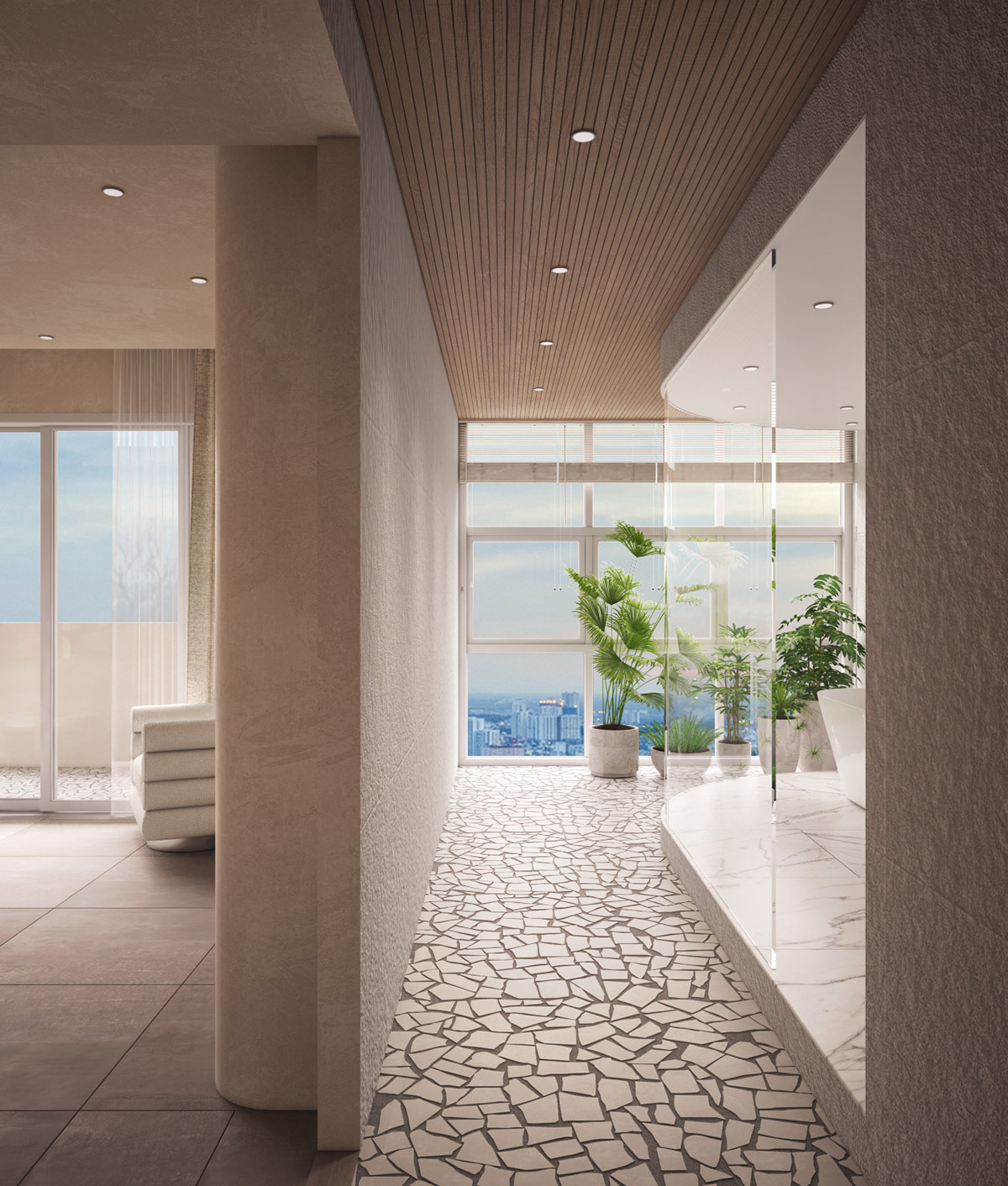 紋理地毯與觸覺沙發內飾相得益彰。三葉形大理石咖啡桌成為獨特的中央焦點。