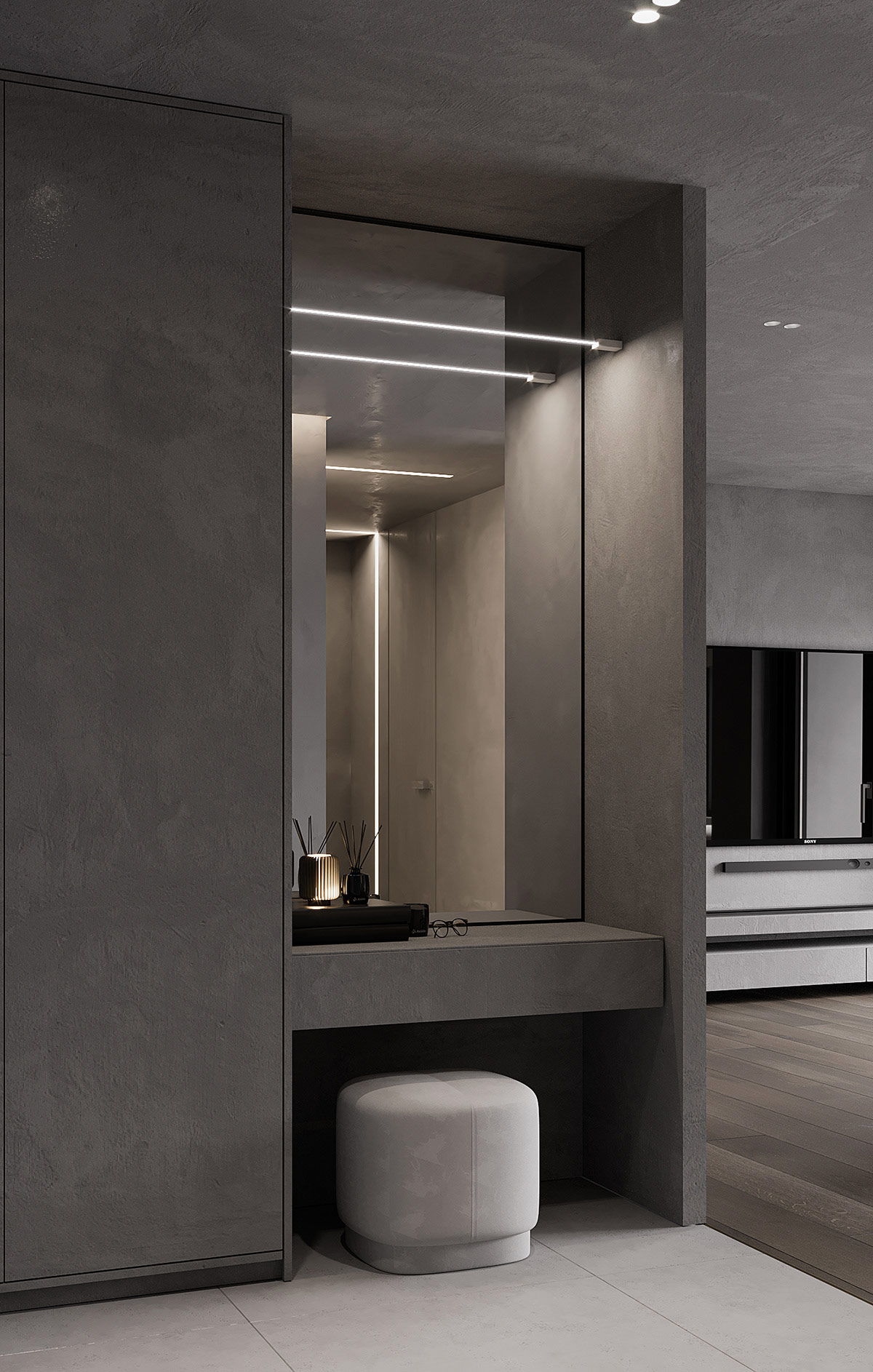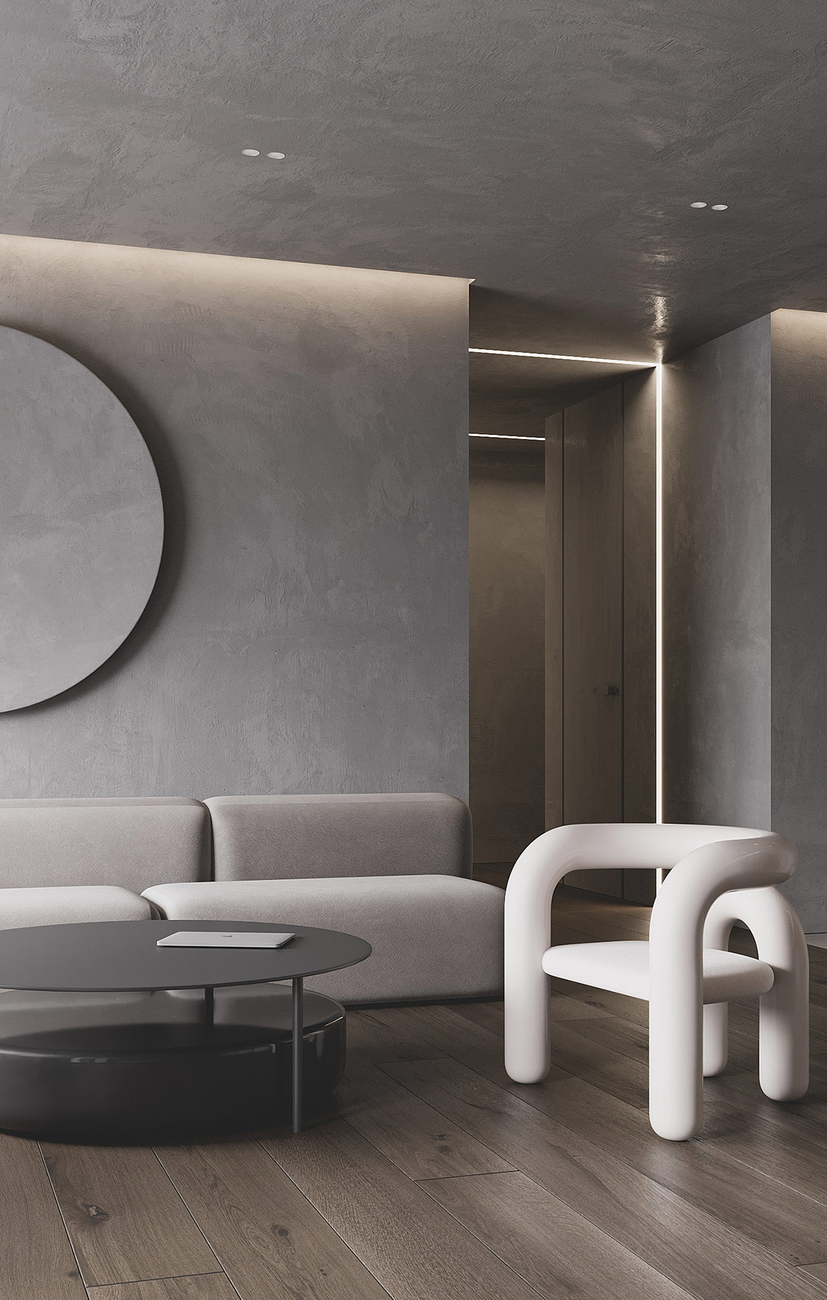 甲圓茶幾補充圓形混凝土墻技術。嵌入式周邊燈突出了工業墻的質感,而另一條 LED 燈帶在客廳門口畫了一個明亮的拱形。