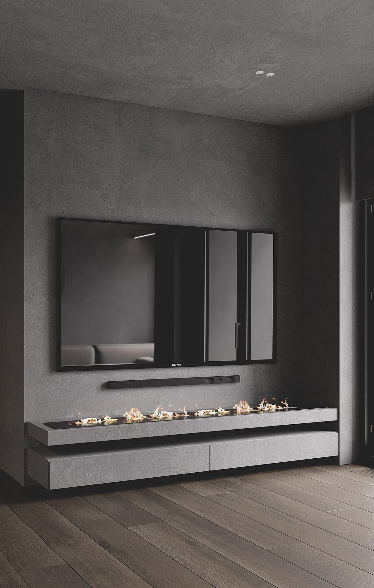 浮動擱板為混凝土壁龕增添了裝飾特色。