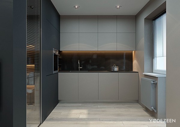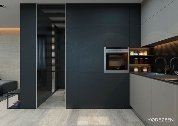 廚房非常簡約。左側的啞光黑色鑲板讓中性櫥柜脫穎而出。