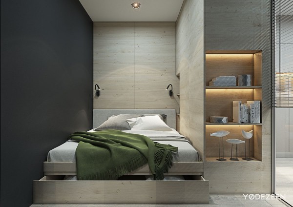 雖然初是一個真正的工作室布局,但設計師為臥室提供了自己的各種附件?;瑒硬AчT可以提供充足的陽光,儲物墻提供足夠的隱私。