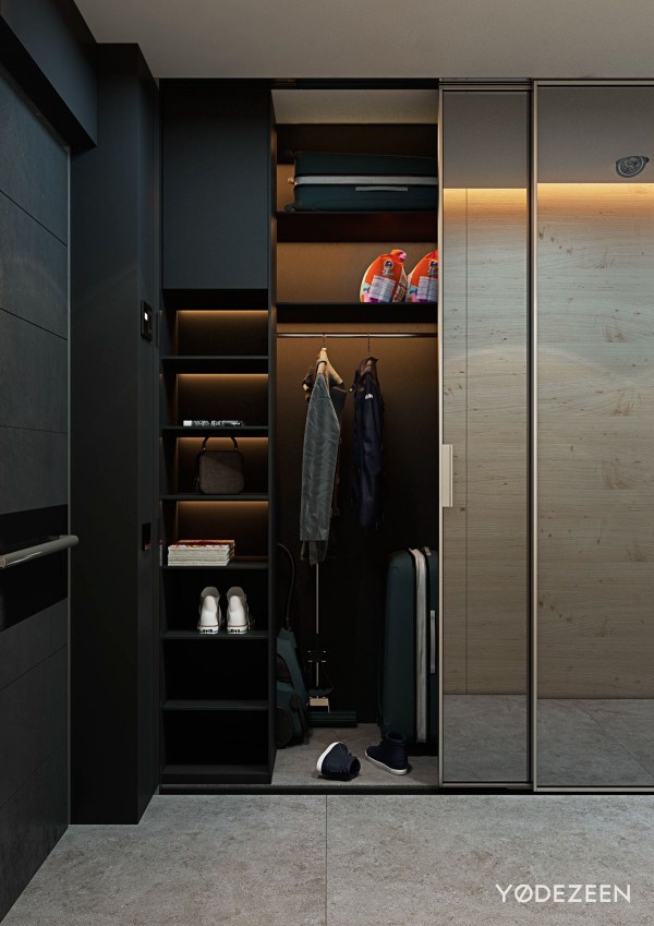 在入口附近,更多的滑動鏡子隱藏了一個方便的衣帽間,里面有住戶出門所需的一切。間接照明使得即使在像這里這樣黑暗的空間中也可以找到任何物品。