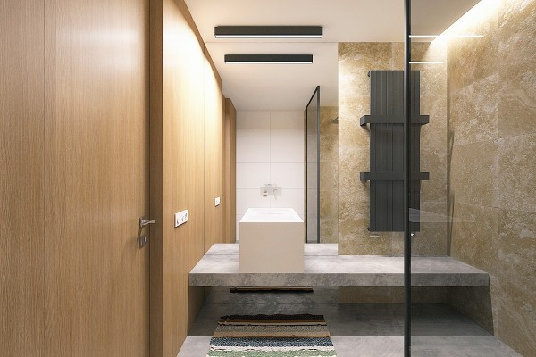 自然色的條紋地毯有助于浴室從家中的其他部分中脫穎而出。