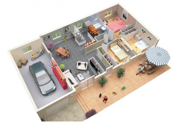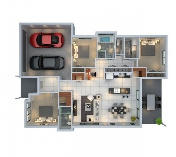 仔細考慮將這個三臥室設計空間用于兩車位車庫以及室內和室外用餐區。