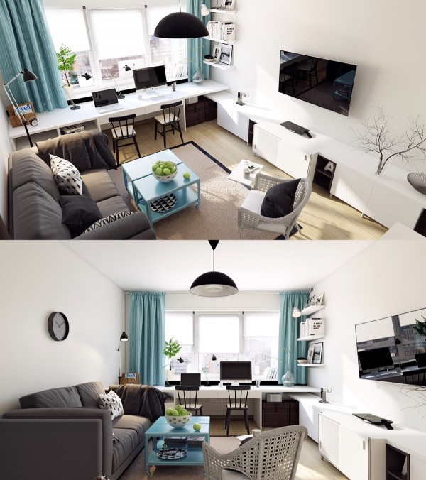 您不需要大量空間來執行這些想法。青色的互補色調(在躺椅和現代沙發中)和超流暢的線條在這里是完美的。