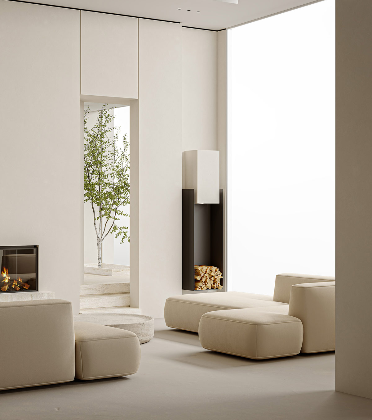 一個垂直的原木存儲單元整齊地懸掛在一個狹窄的壁龕內。它的深色飾面完美地平衡了敞開門口另一側的壁爐。門框內精美地展示了室內樹。