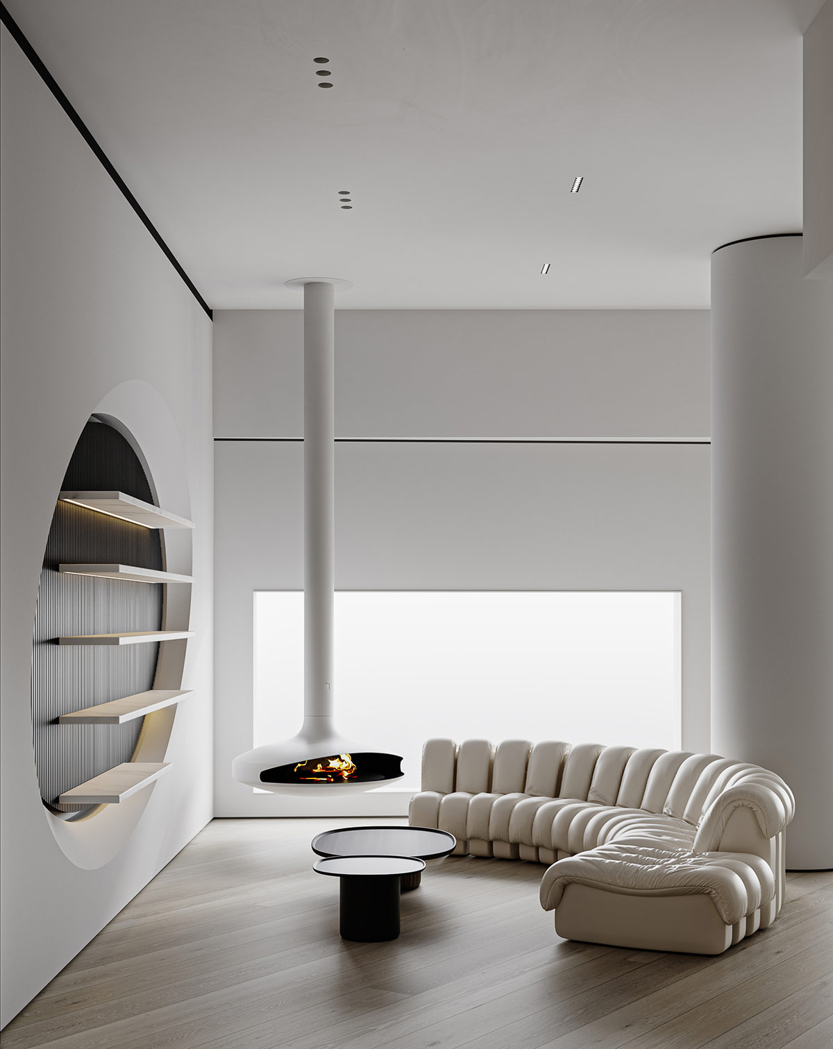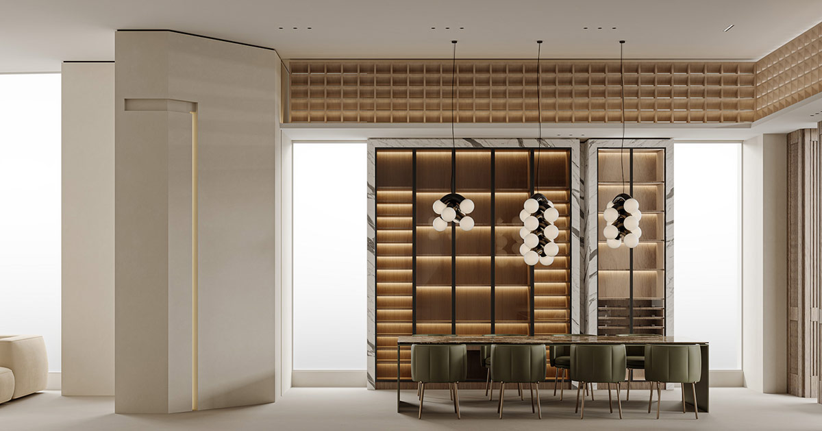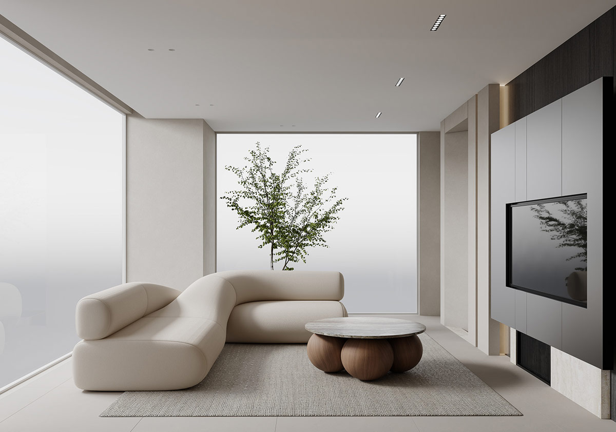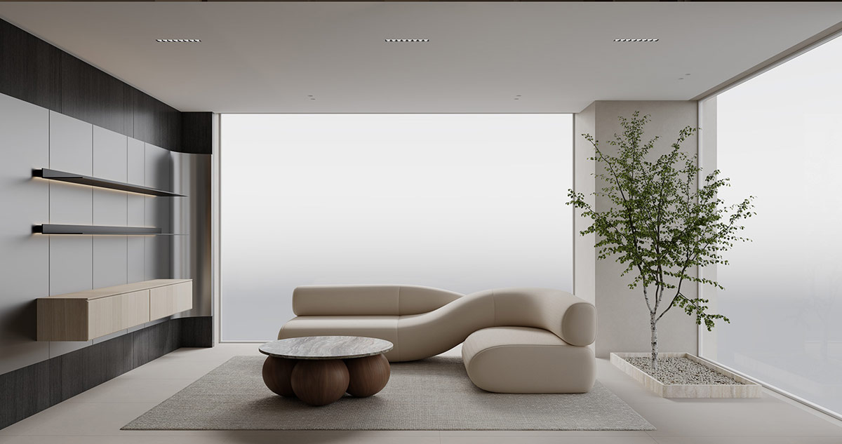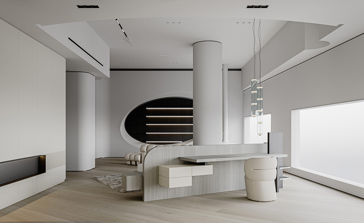 夢幻般的家具為這個酷酷的奶油色內飾帶來了形狀創(chuàng)意的精髓,由中國渲染師夢太初形象化。雖然這里的裝飾主要是灰白的,但對比的時刻產生了清晰度和戲劇性。