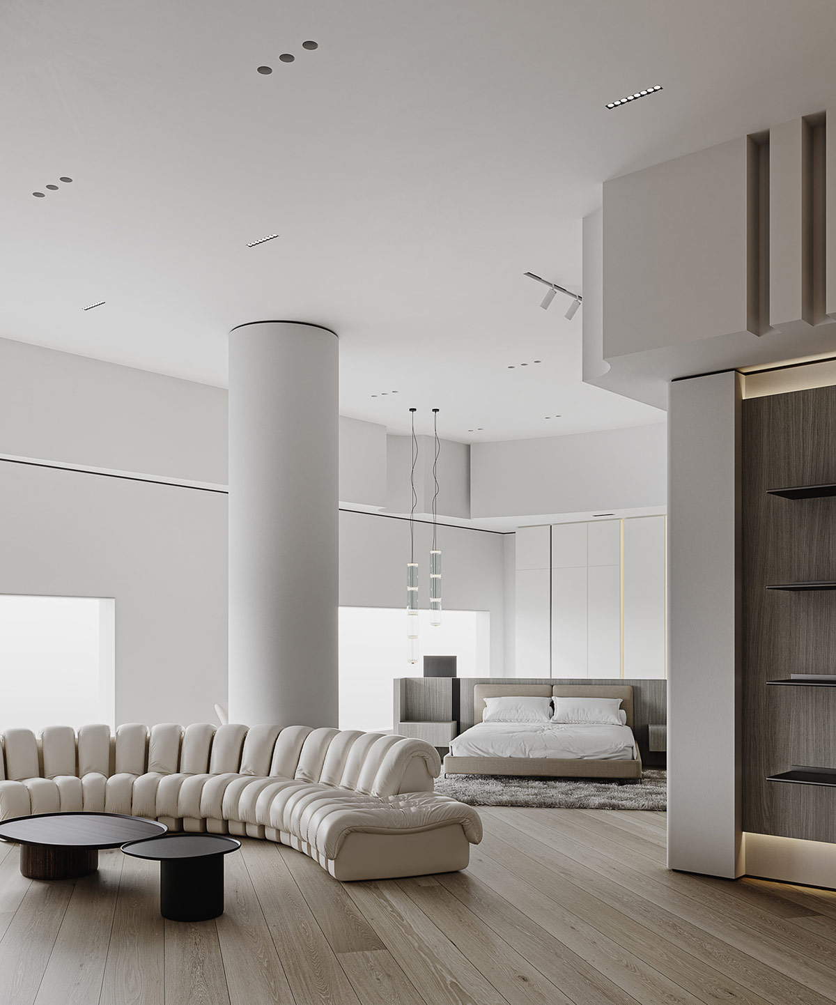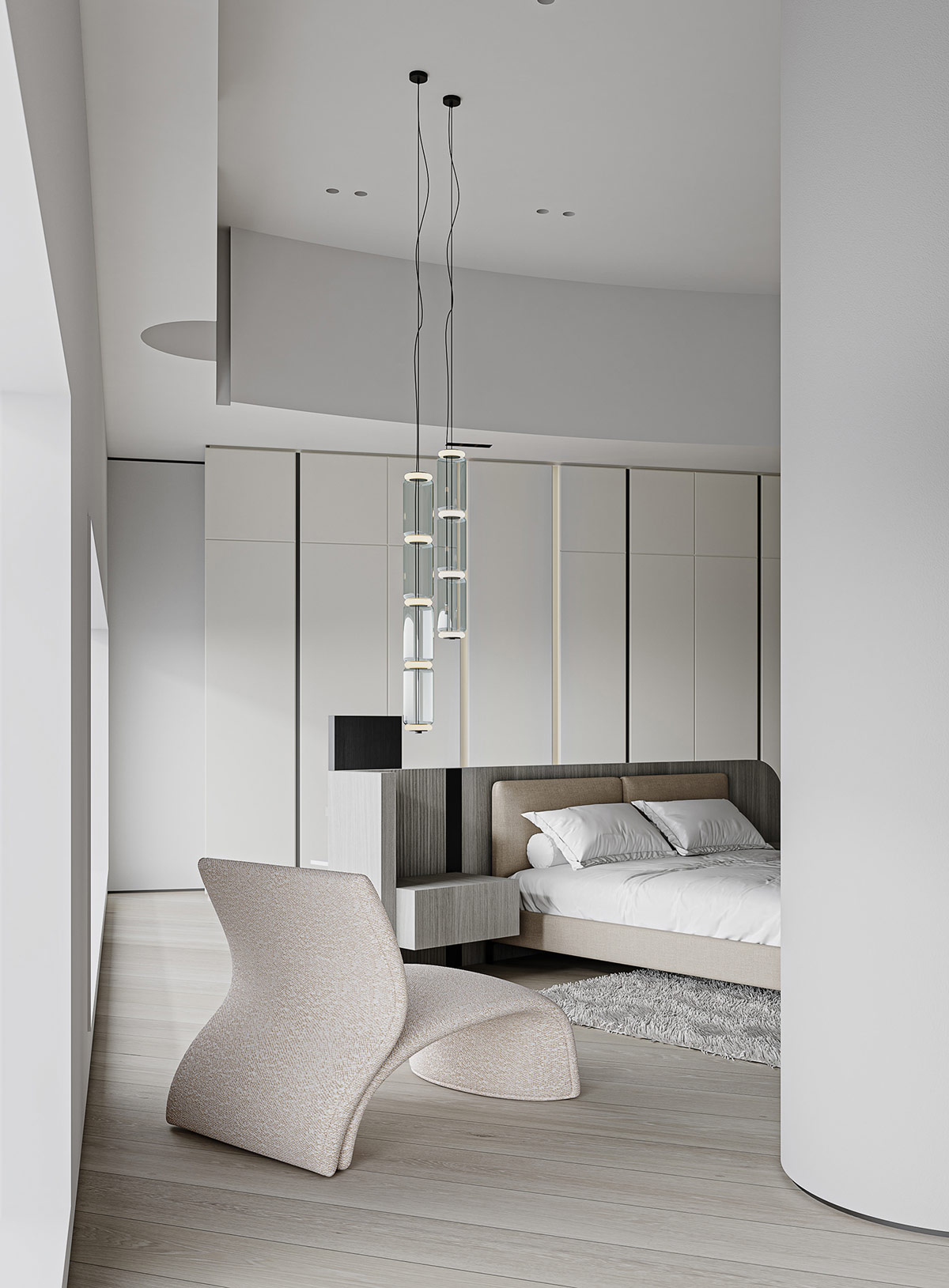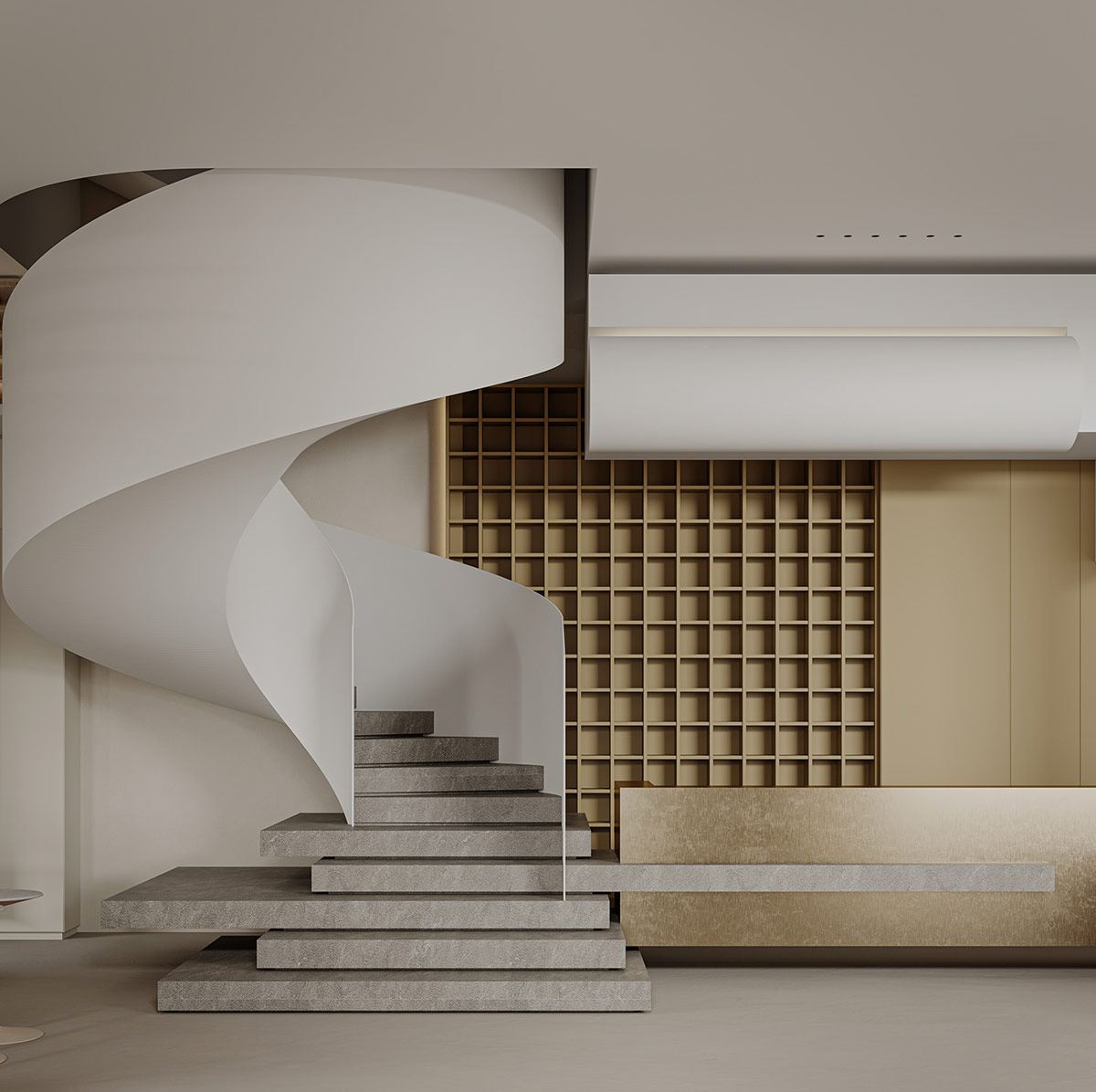夢幻般的家具為這個酷酷的奶油色內飾帶來了形狀創(chuàng)意的精髓,由中國渲染師夢太初形象化。雖然這里的裝飾主要是灰白的,但對比的時刻產生了清晰度和戲劇性。