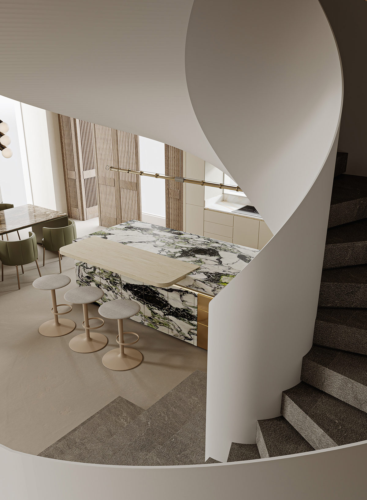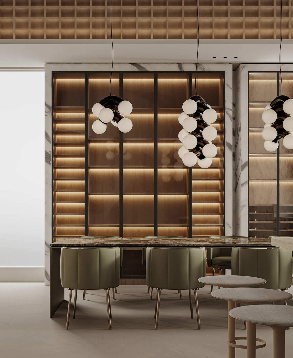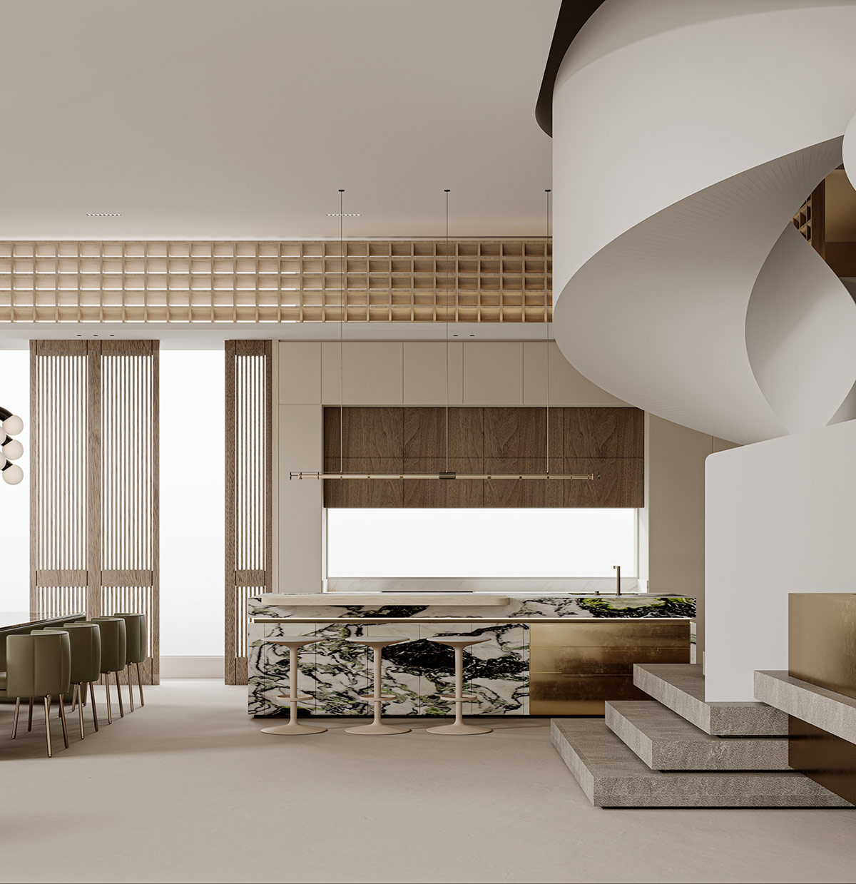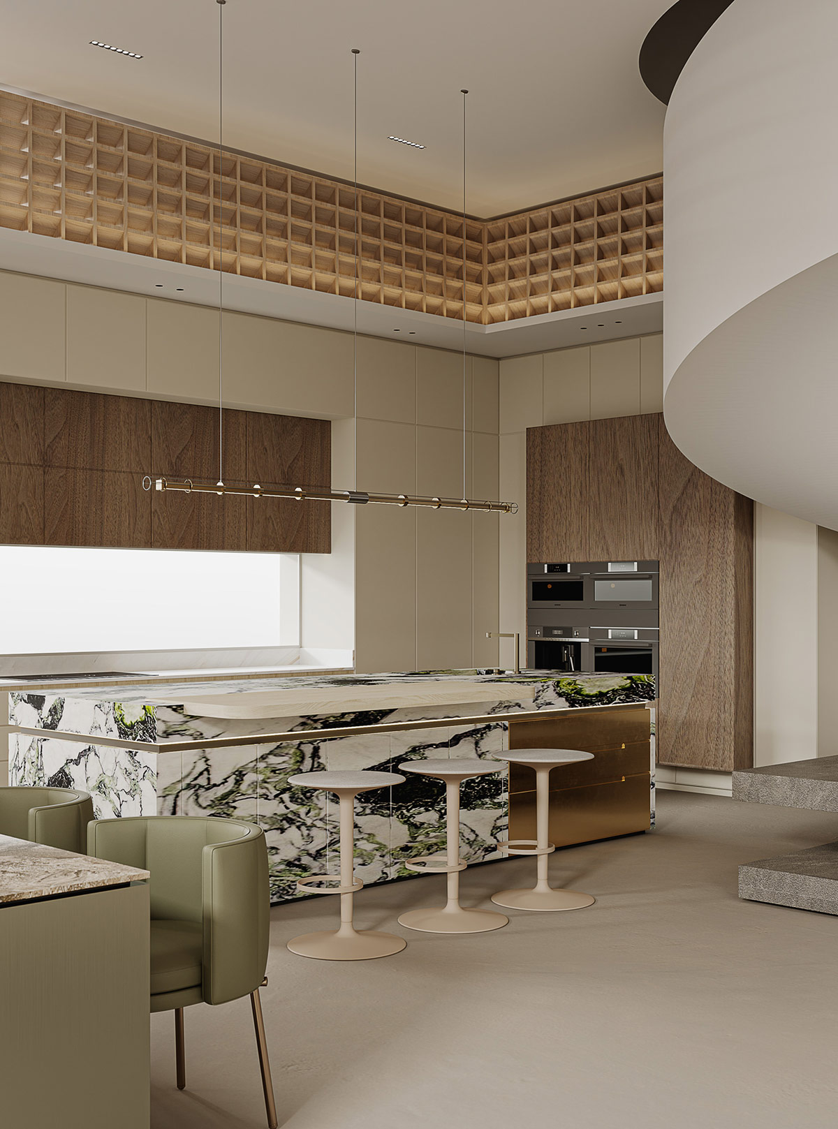現(xiàn)代線性懸掛燈照亮華麗的大理石島設計。綠色點綴在大理石飾面上旋轉,與相鄰的餐椅形成微妙的色彩聯(lián)系。