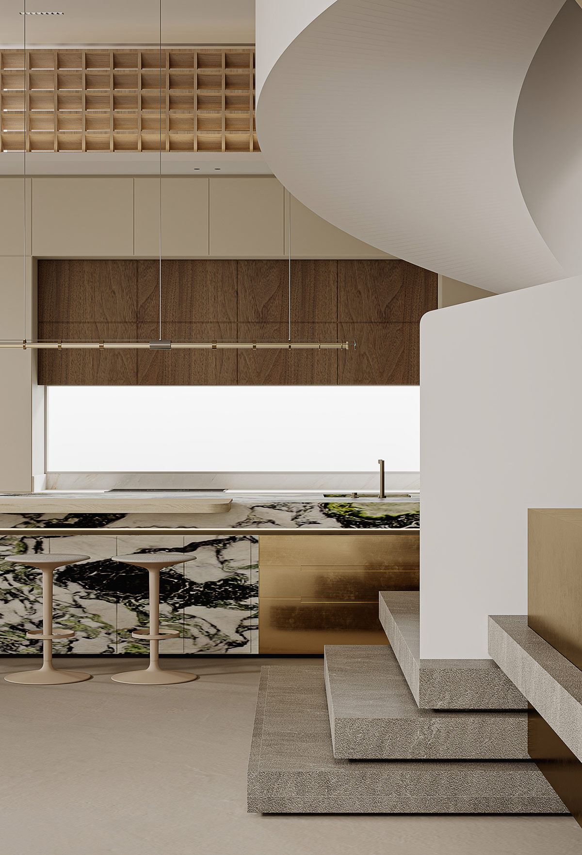 純奶油色單元輕輕地勾勒出廚房裝置的背面,胡桃木壁單元增添了豐富的核心。閃亮的金色抽屜單元突出了通往樓梯的獨特廚房島臺設計的盡頭。