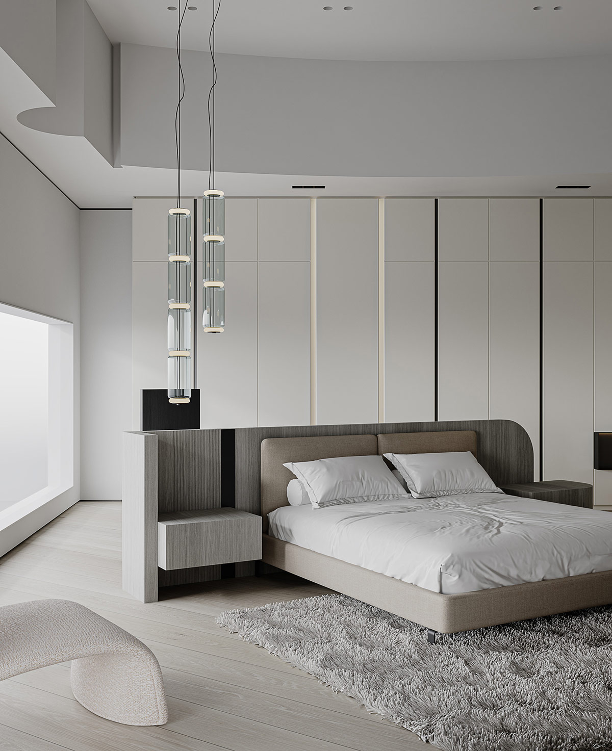 軟墊床采用獨特的帶翼床頭板設計,作為睡眠區(qū)和更衣區(qū)之間的半高房間隔板。