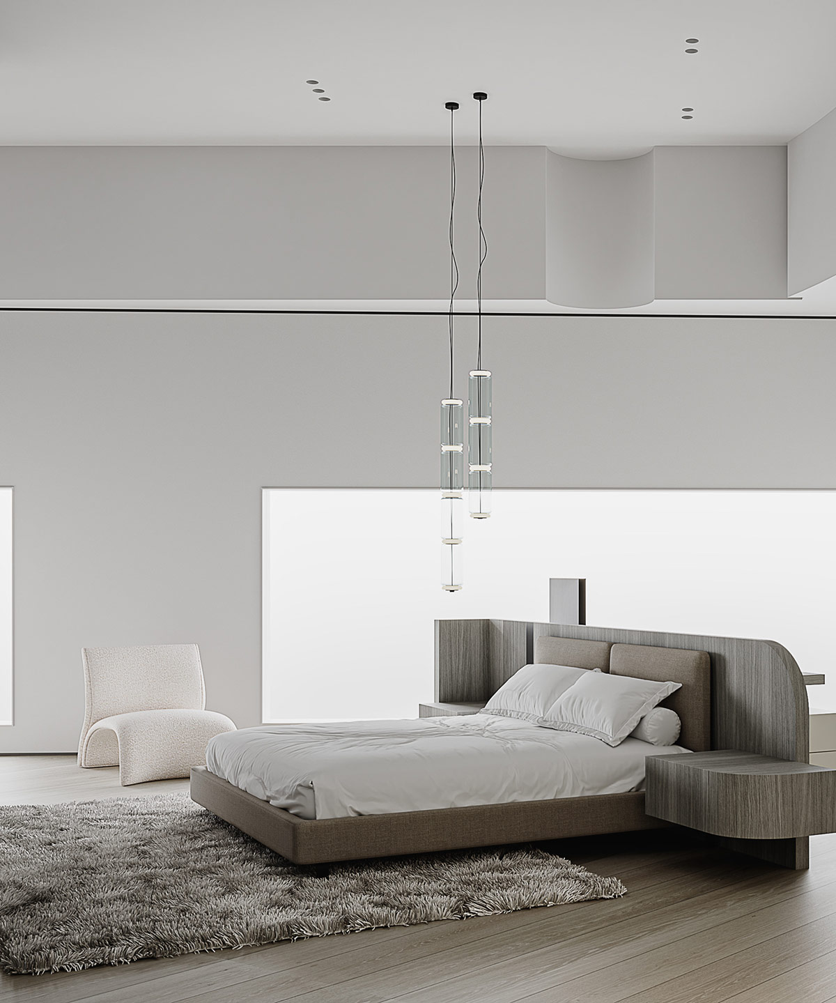 兩盞現(xiàn)代玻璃臥室吊燈從床的一側下降,白天它們也很吸引人地從窗戶捕捉自然光。
