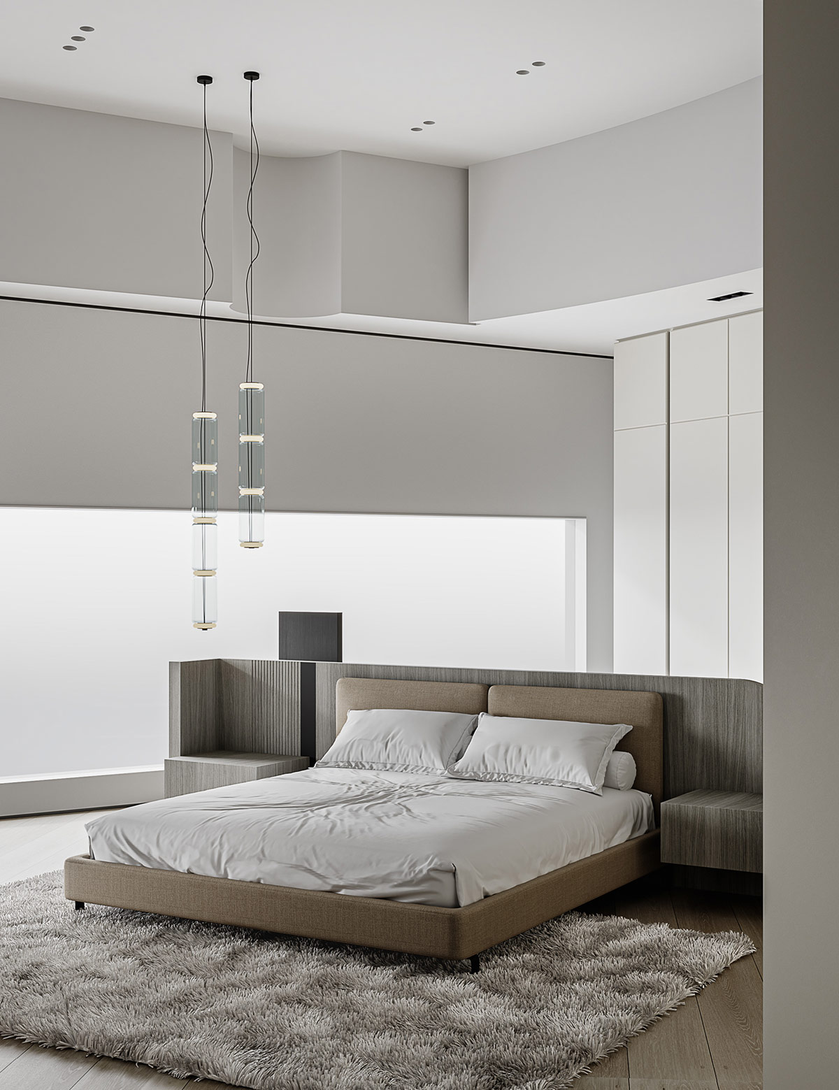 一張毛茸茸的地毯在床周圍鋪上一種超級舒適的灰色調,這也有助于軟化大房間的音響效果。