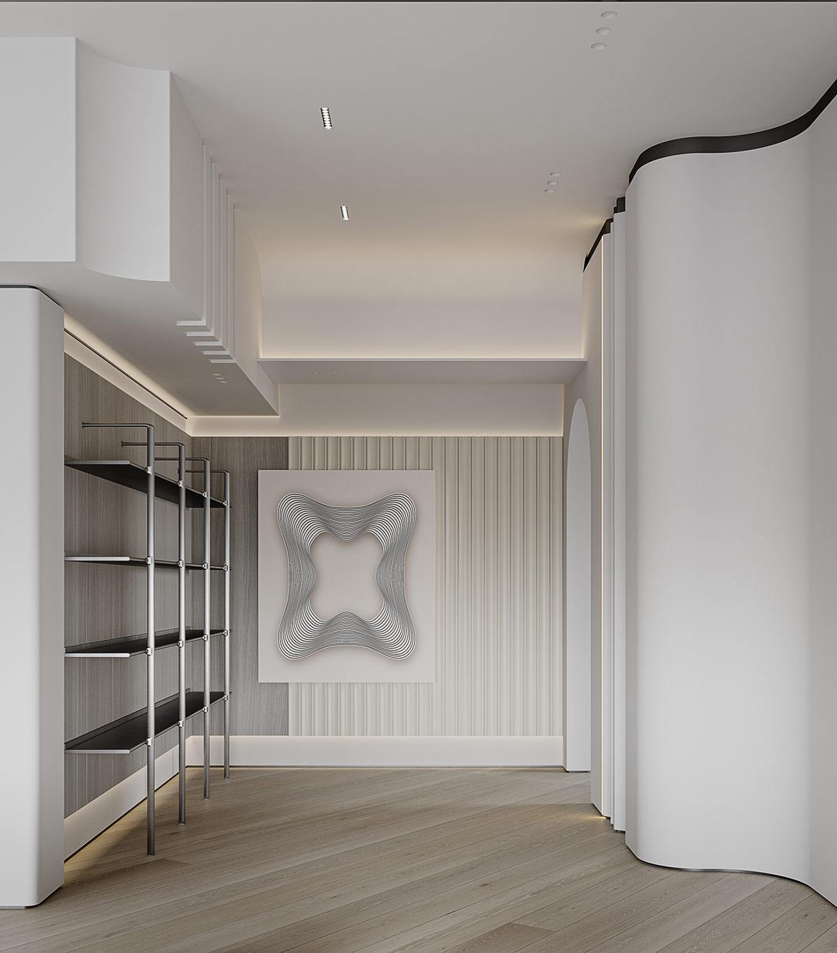 發(fā)光的壁架創(chuàng)造性地包含在一個凹進的橢圓形壁龕內。棱紋石膏在高對比度黑色飾面下提供紋理背景。