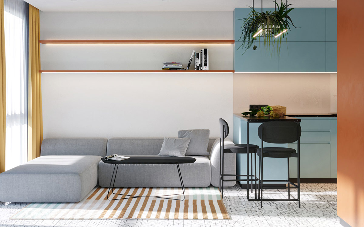 涼爽的天藍色櫥柜在小型開放式客廳角落勾勒出廚房布置。微風輕拂的顏色將烹飪區(qū)和緊湊的用餐半島區(qū)分開來。