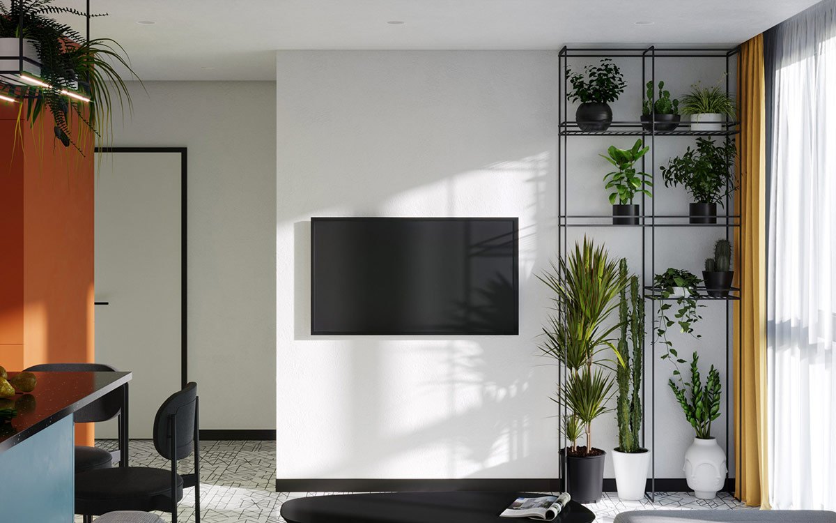 大量的室內植物被布置在一個黑色的線框擱架單元上,位于窗戶旁邊,以確保它們獲得充足的陽光。這些植物在平坦的白色電視墻上長出一種有吸引力的紋理特征。