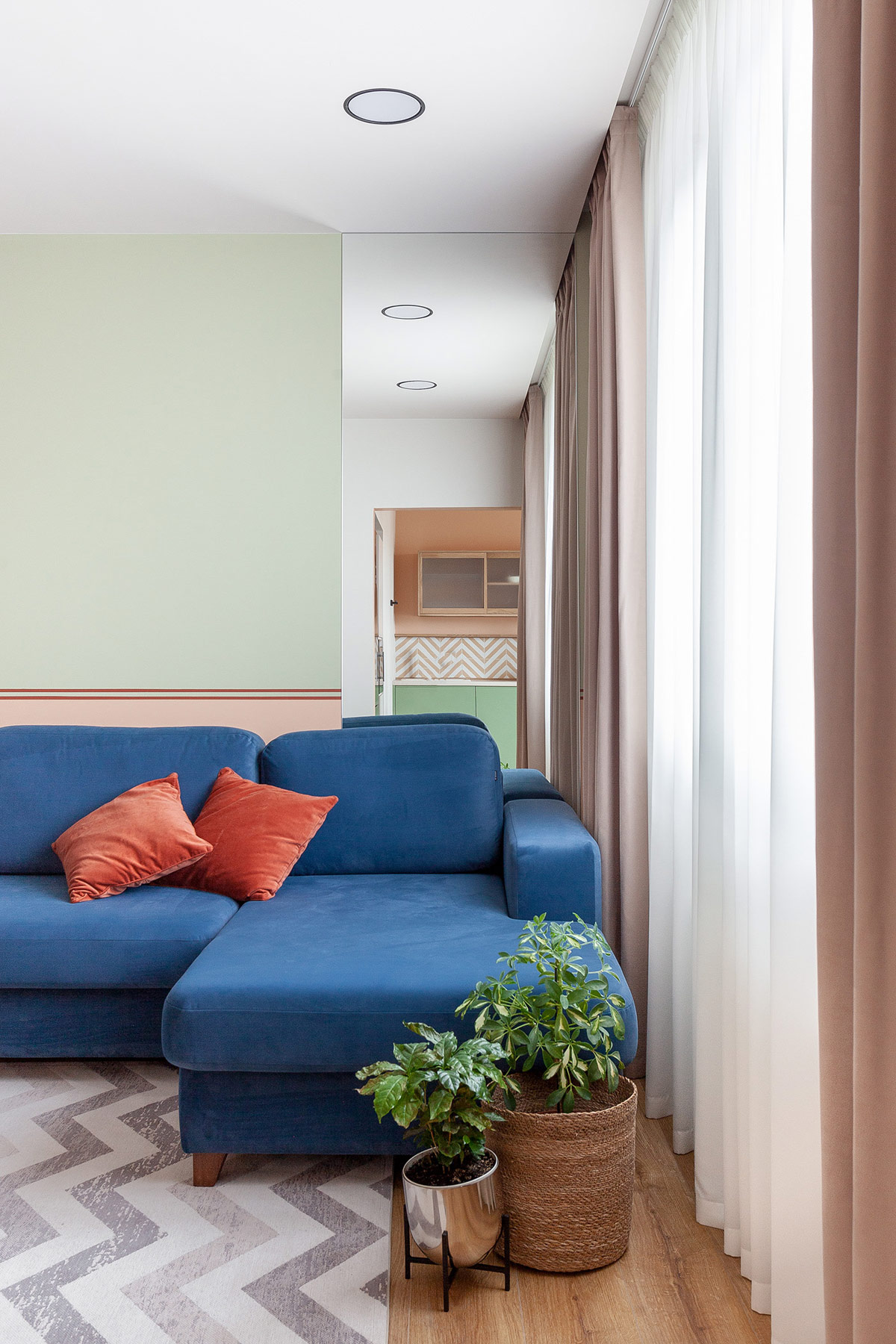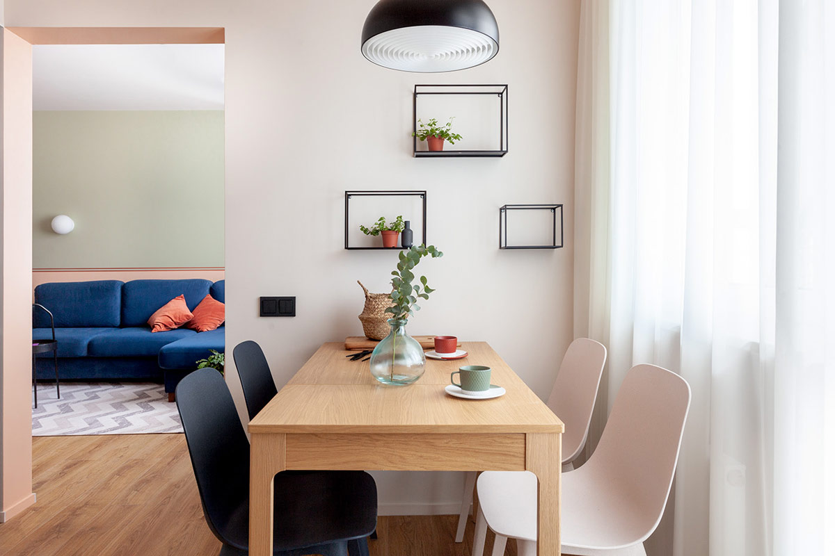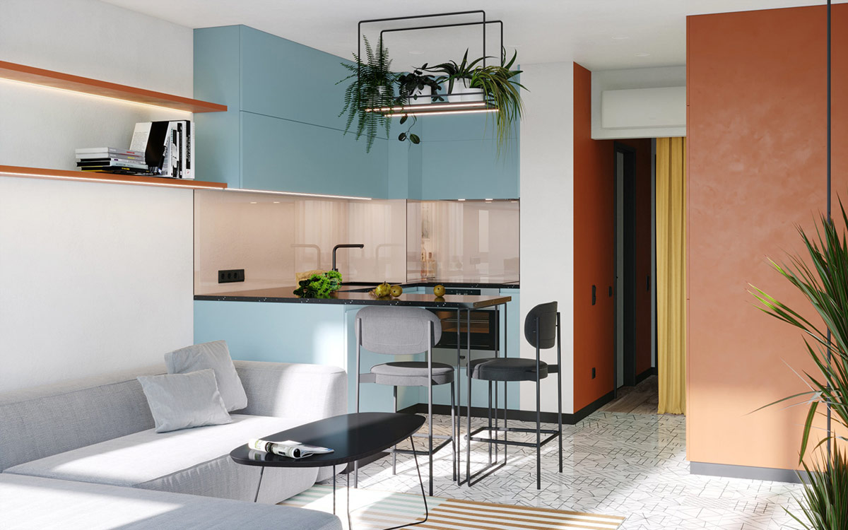 莫斯科這座色彩繽紛的公寓采用藍色、綠色和橙色的對比色打造而成。木地板和獨特的花盆帶來柔和的自然色調。