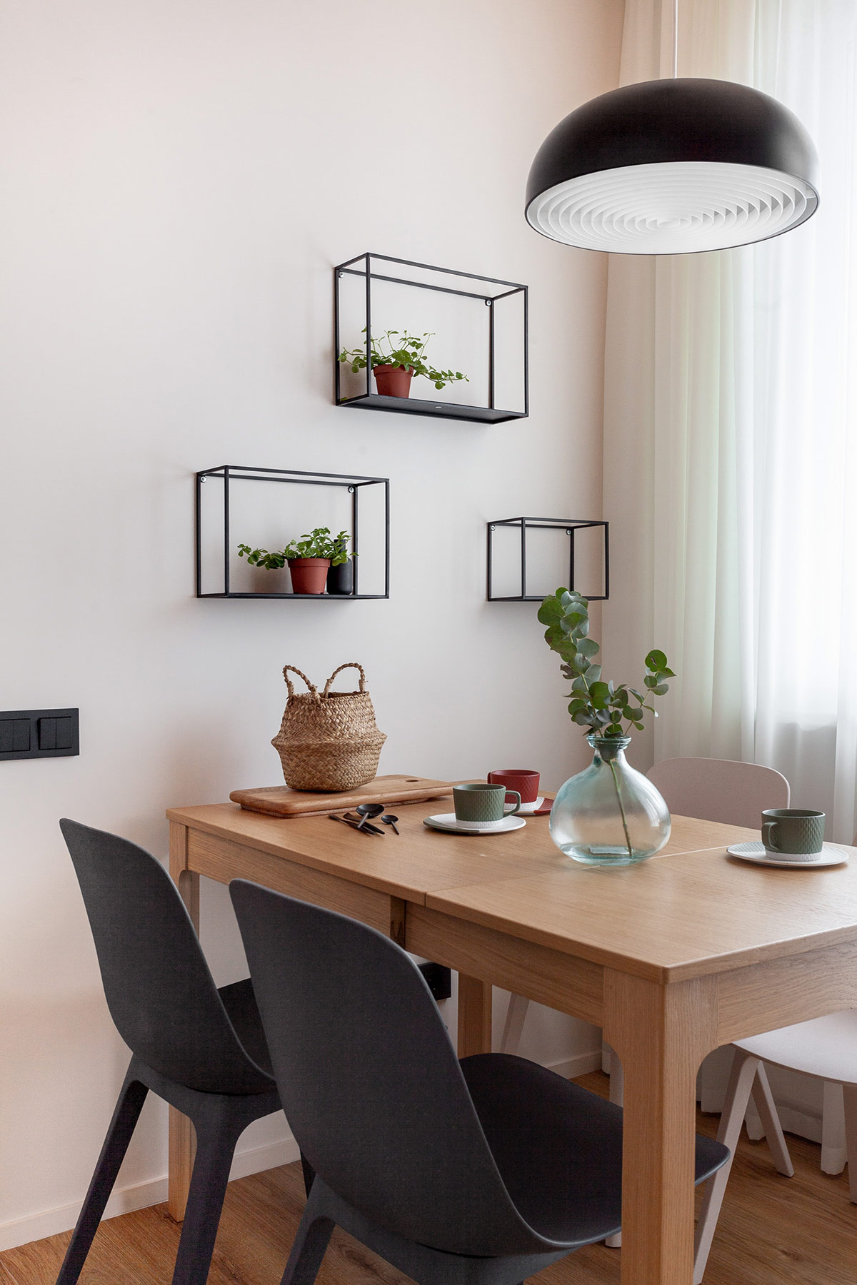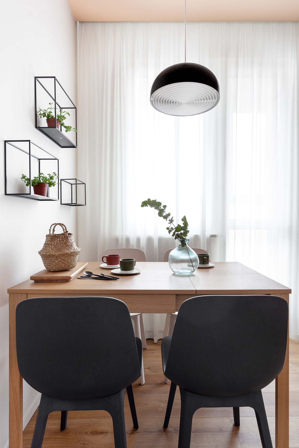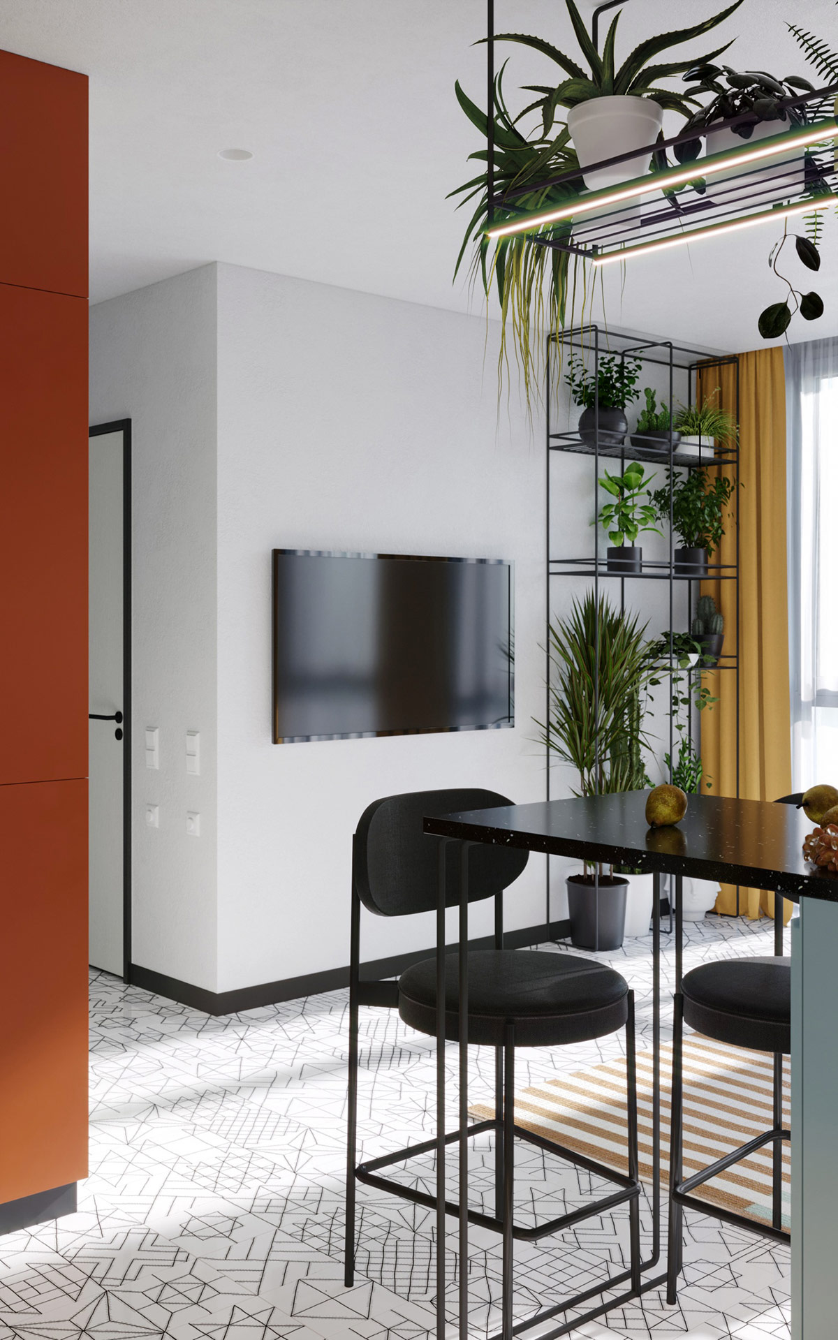 黑色廚房吧臺凳與光滑的黑色廚房臺面和相鄰休息區(qū)的咖啡桌相協(xié)調。工業(yè)線框燈和儲物架將黑色調帶到天花板上,為更有吸引力的綠色樹葉創(chuàng)造一個節(jié)省空間的家。