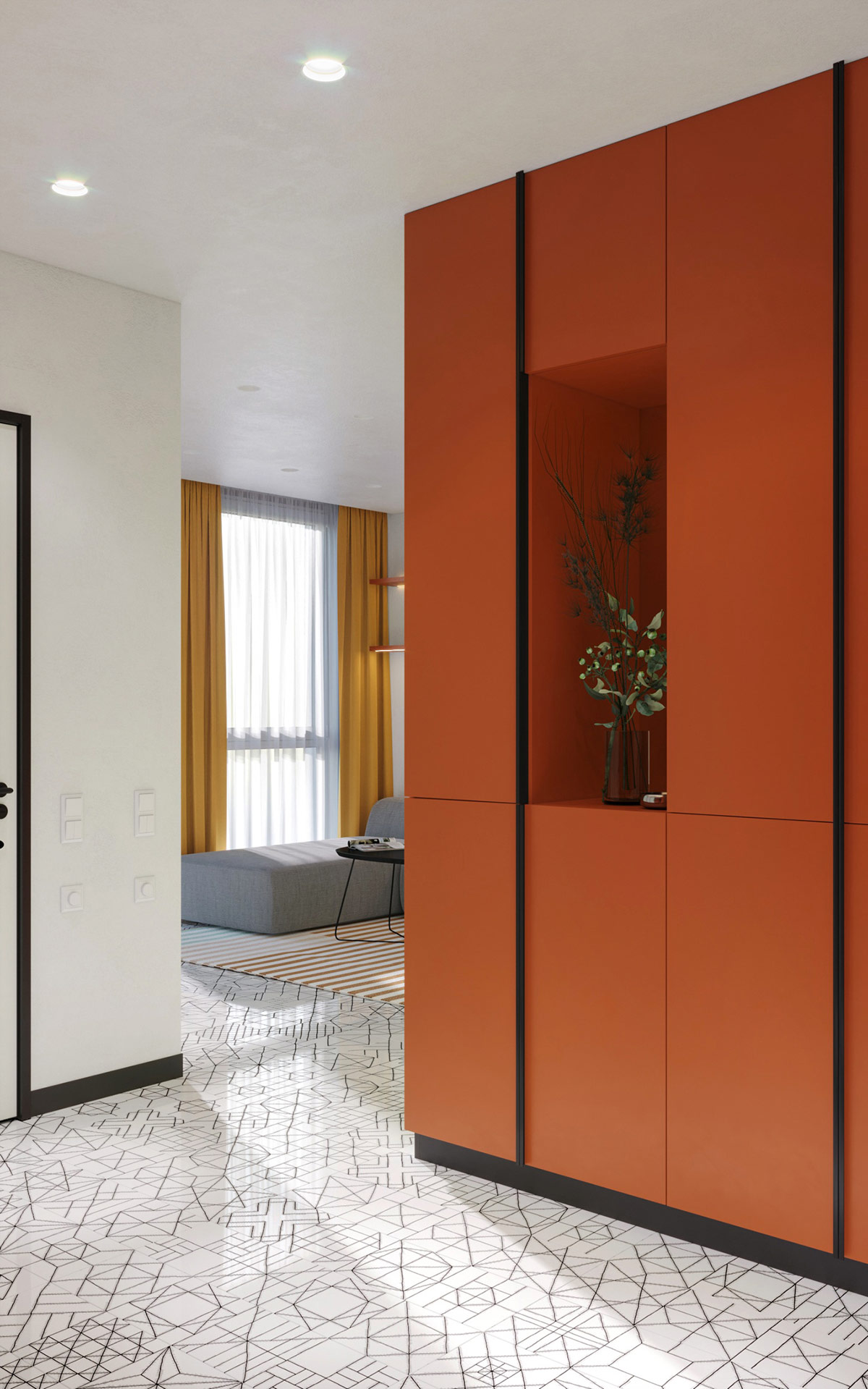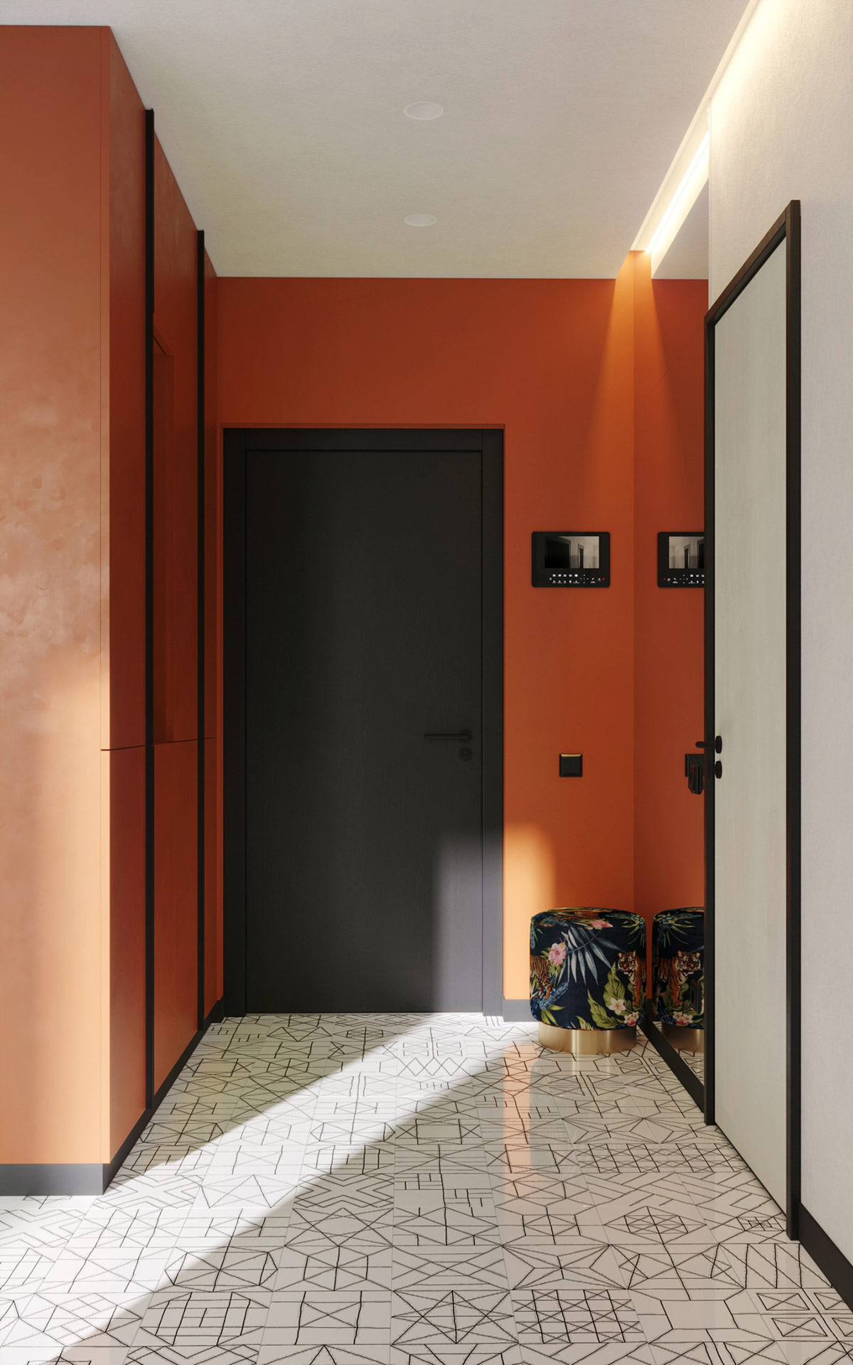 橙色的口音滲透到對比鮮明的黑色前門周圍的油漆中。花凳在嵌入式周邊照明下結合了明亮和黑暗的音符。全身無框鏡子營造出增加空間的錯覺。