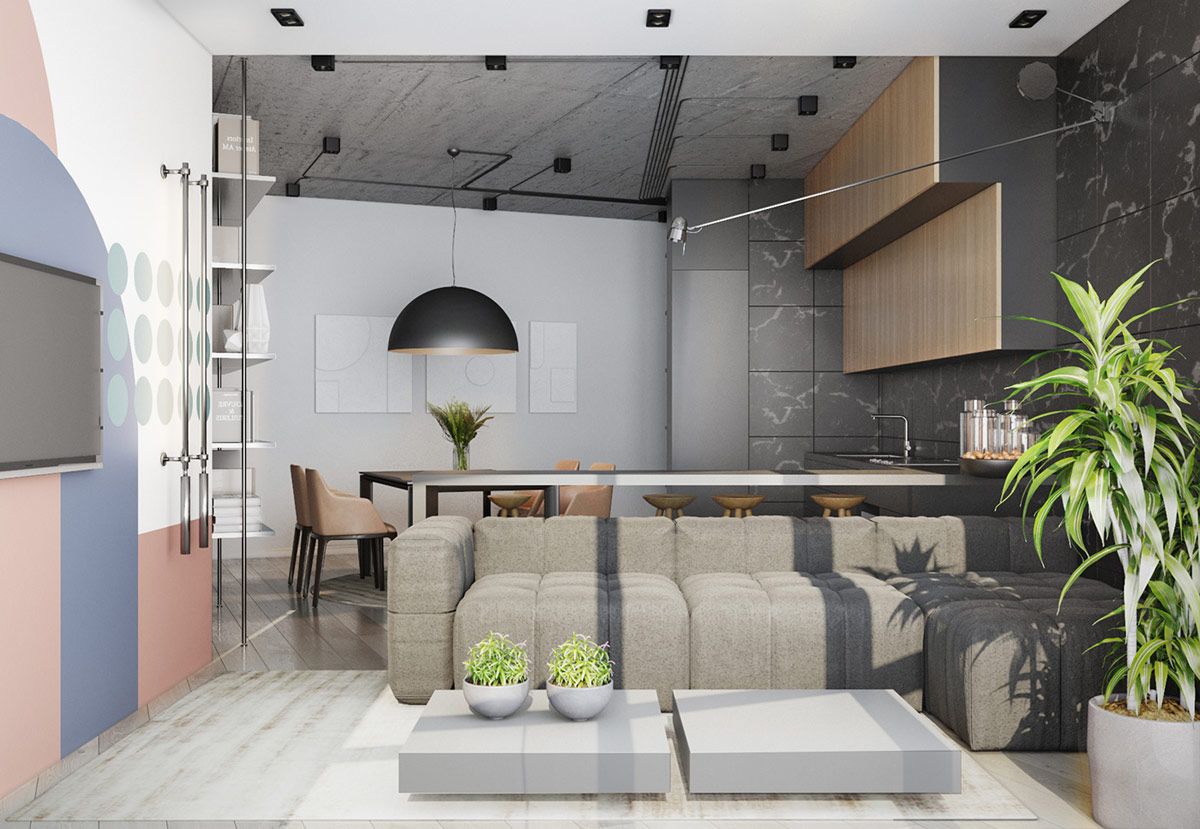 平靜的灰色基色錨定了我們下一個色彩繽紛的家居內飾。一張溫暖的灰色簇絨沙發(fā)伸展在兩張混凝土方形咖啡桌后面。混凝土花盆給矮桌增加了一點高度。