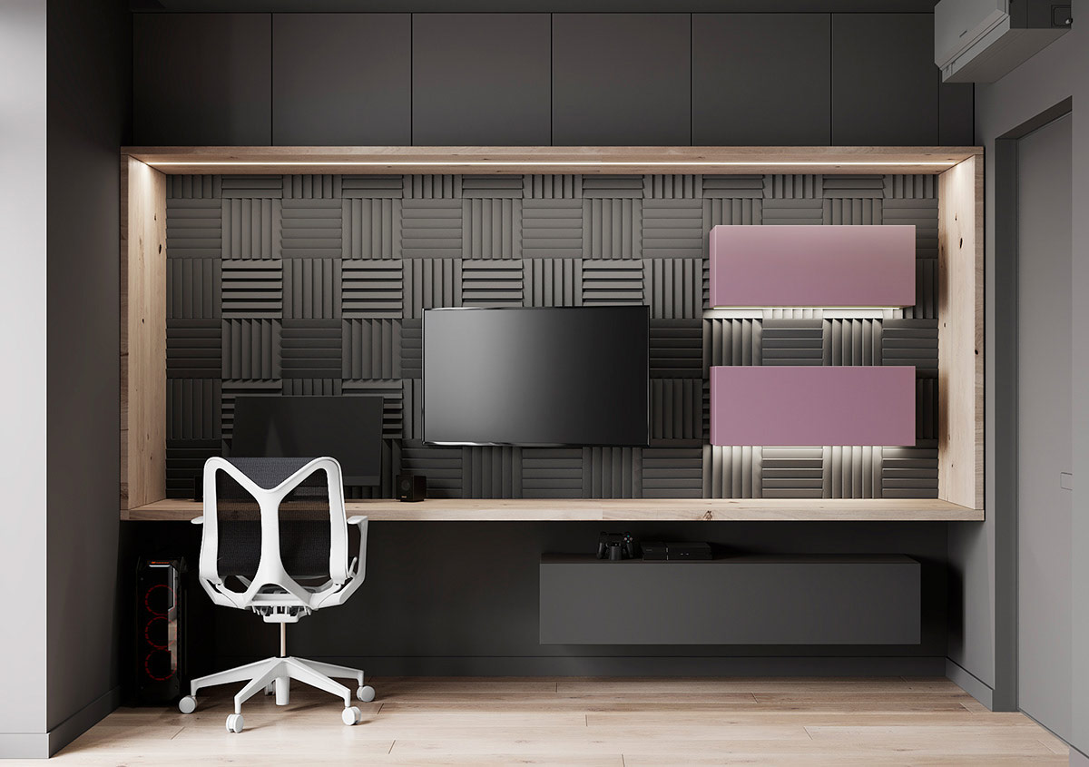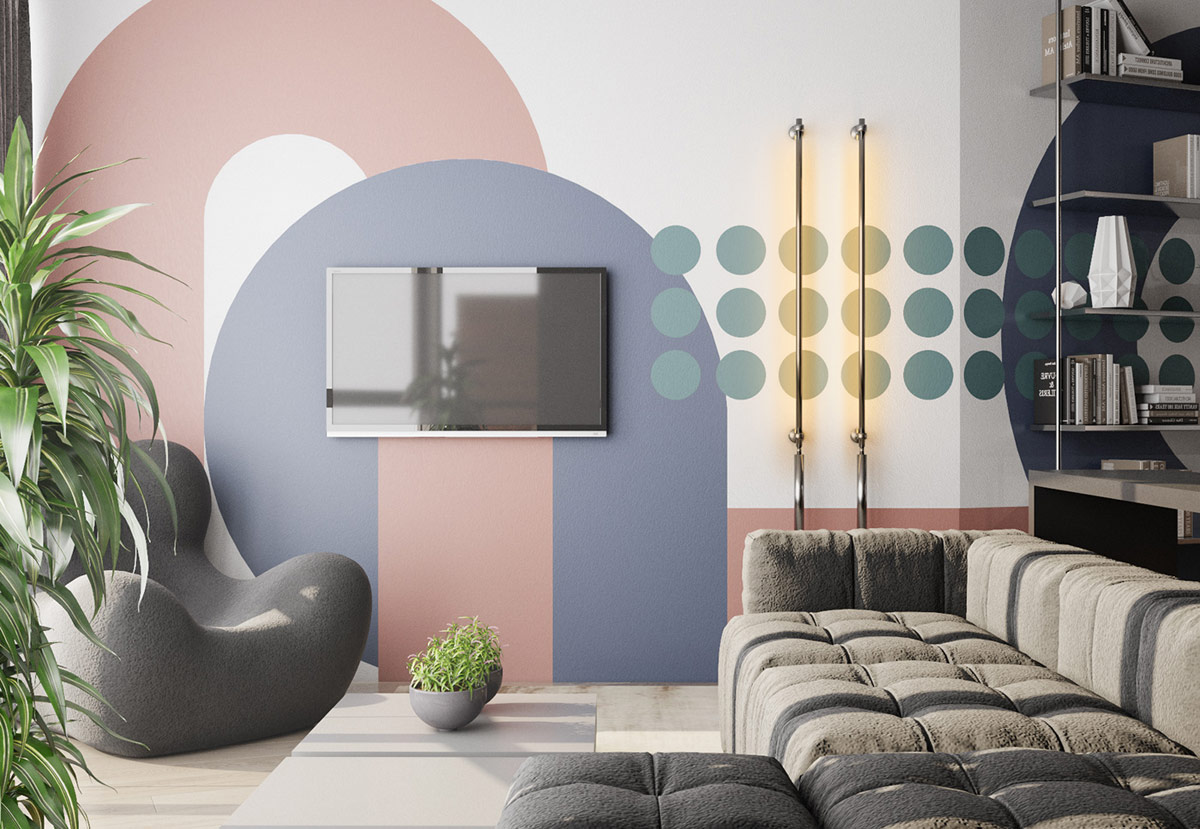 鼓舞人心的電視墻充滿了色彩和藝術圖形壁畫。藍色、紅色和青色的油漆效果為壁掛式電視屏幕創(chuàng)造了一個有趣的支架,并為一對現(xiàn)代壁燈繪制了歡樂的背景。