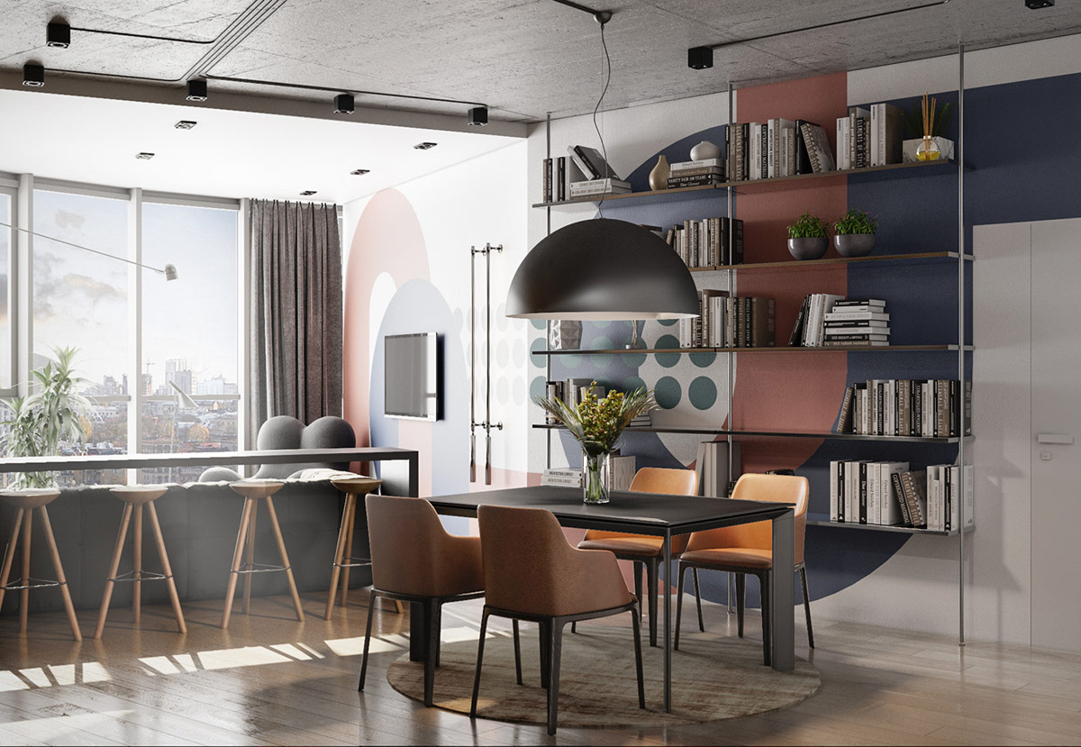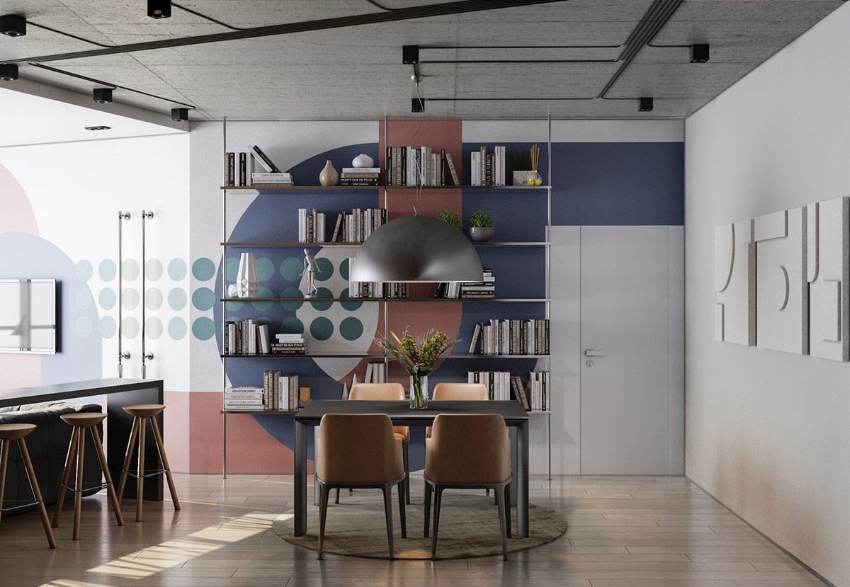 五顏六色的圖形在用餐區(qū)繼續(xù)存在,在那里它們成為一個令人難以置信的背景,用于從地板到天花板的拉緊書柜。超大的餐廳吊燈與壁畫曲線相得益彰。