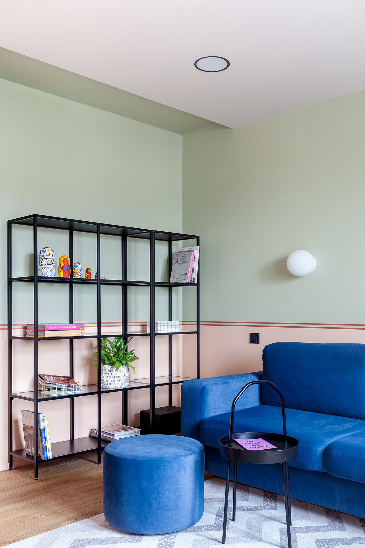 鈷藍色沙發(fā)搭配相配的藍色坐墊凳。黑色托盤式咖啡桌與黑框現(xiàn)代書柜相得益彰,KeithHaring 風格的嵌套娃娃在其中增添了藝術元素。