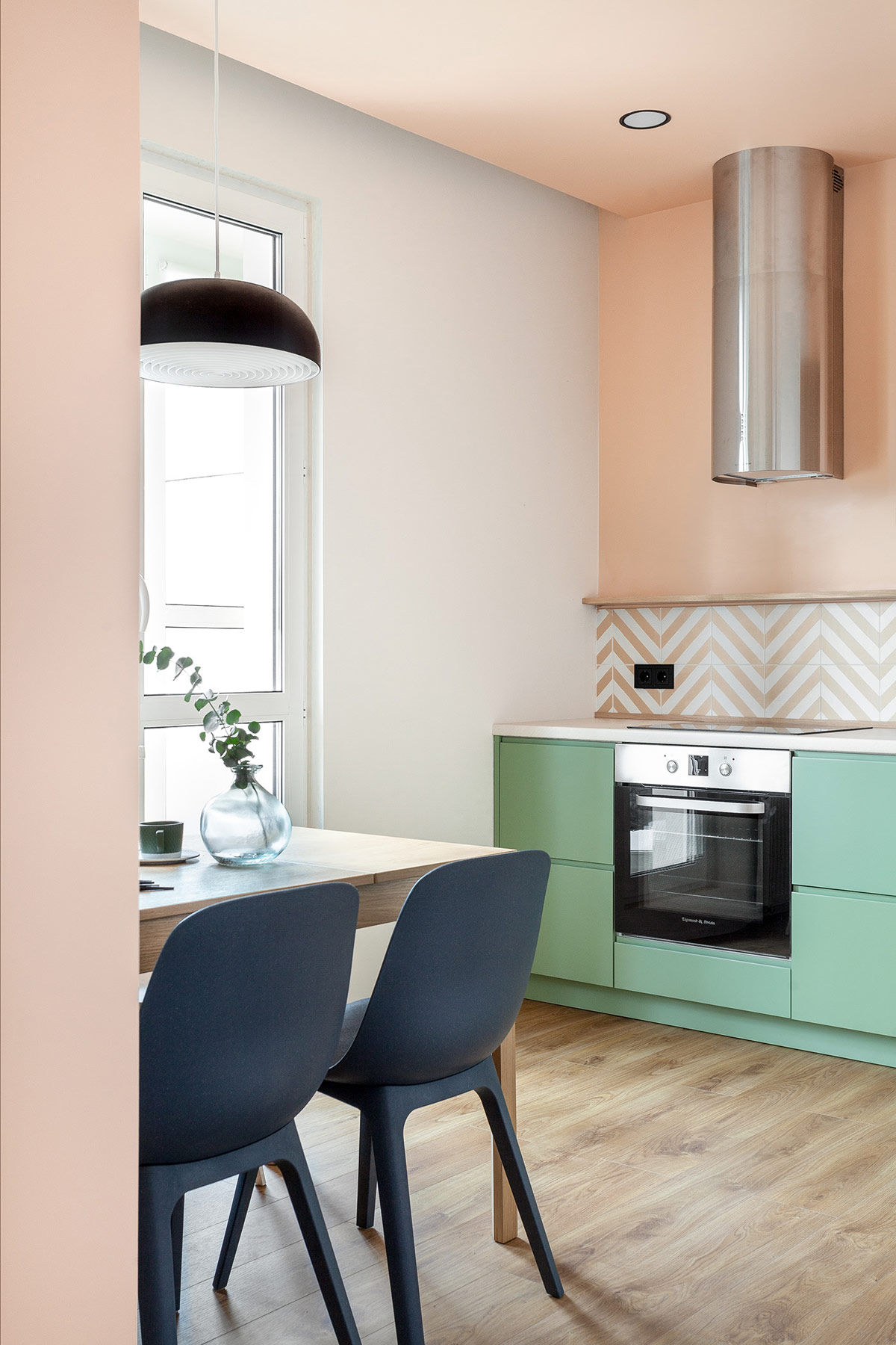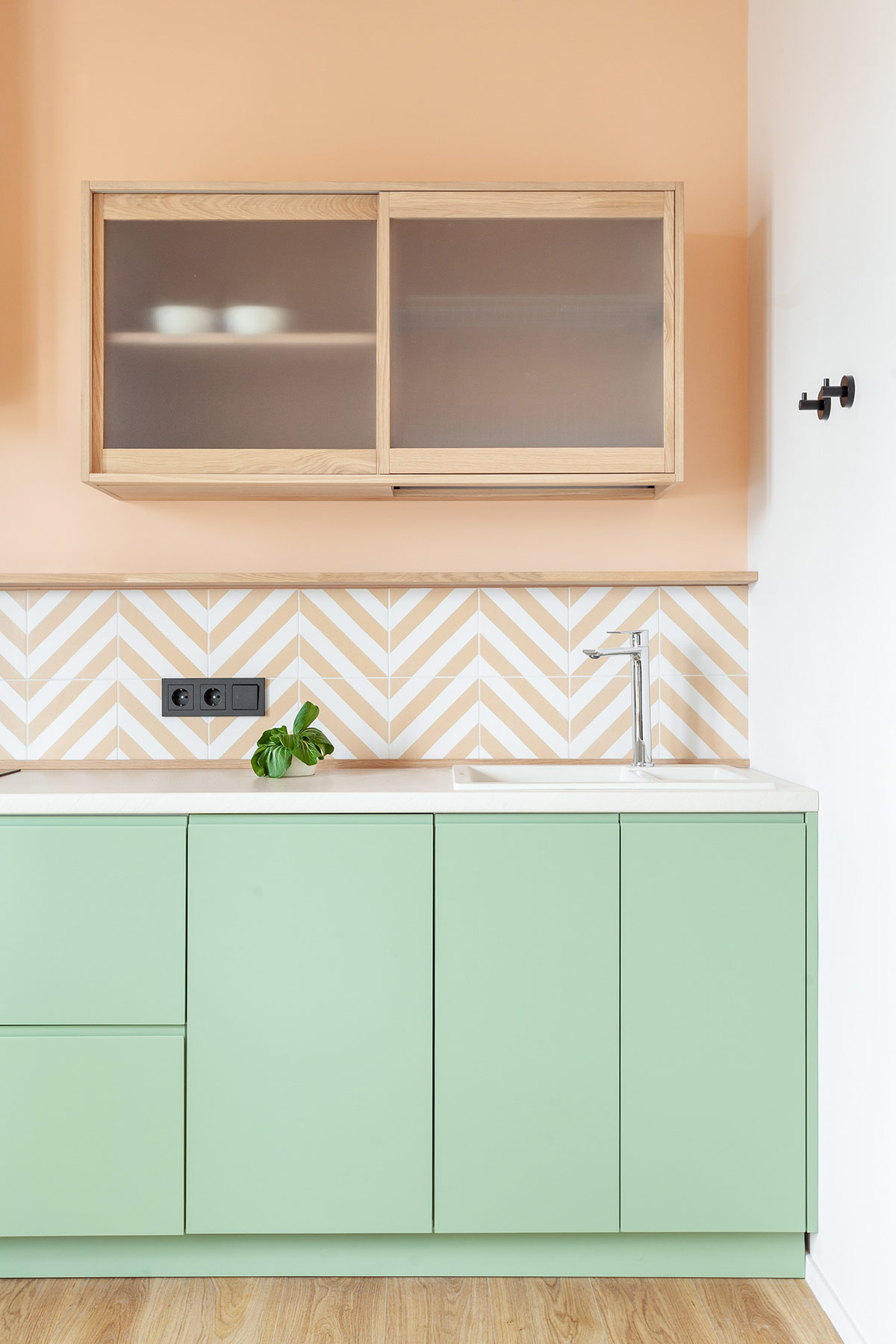 淺綠色廚柜與杏色 V 形后擋板形成鮮明對比。木質色調的壁柜與溫暖的杏色墻漆融為一體。