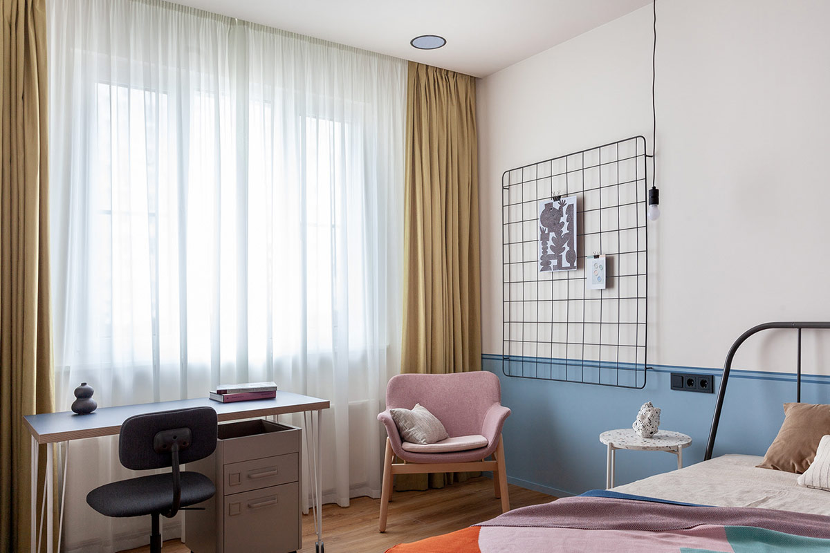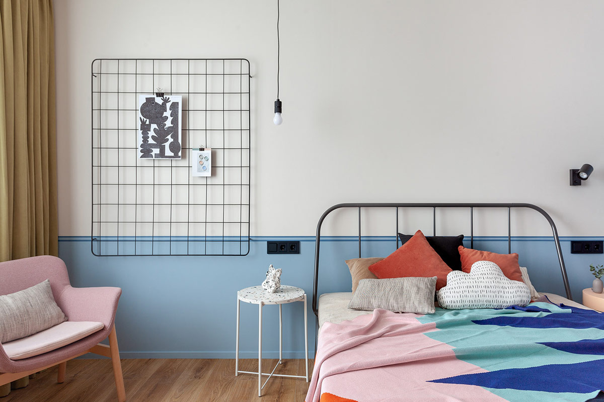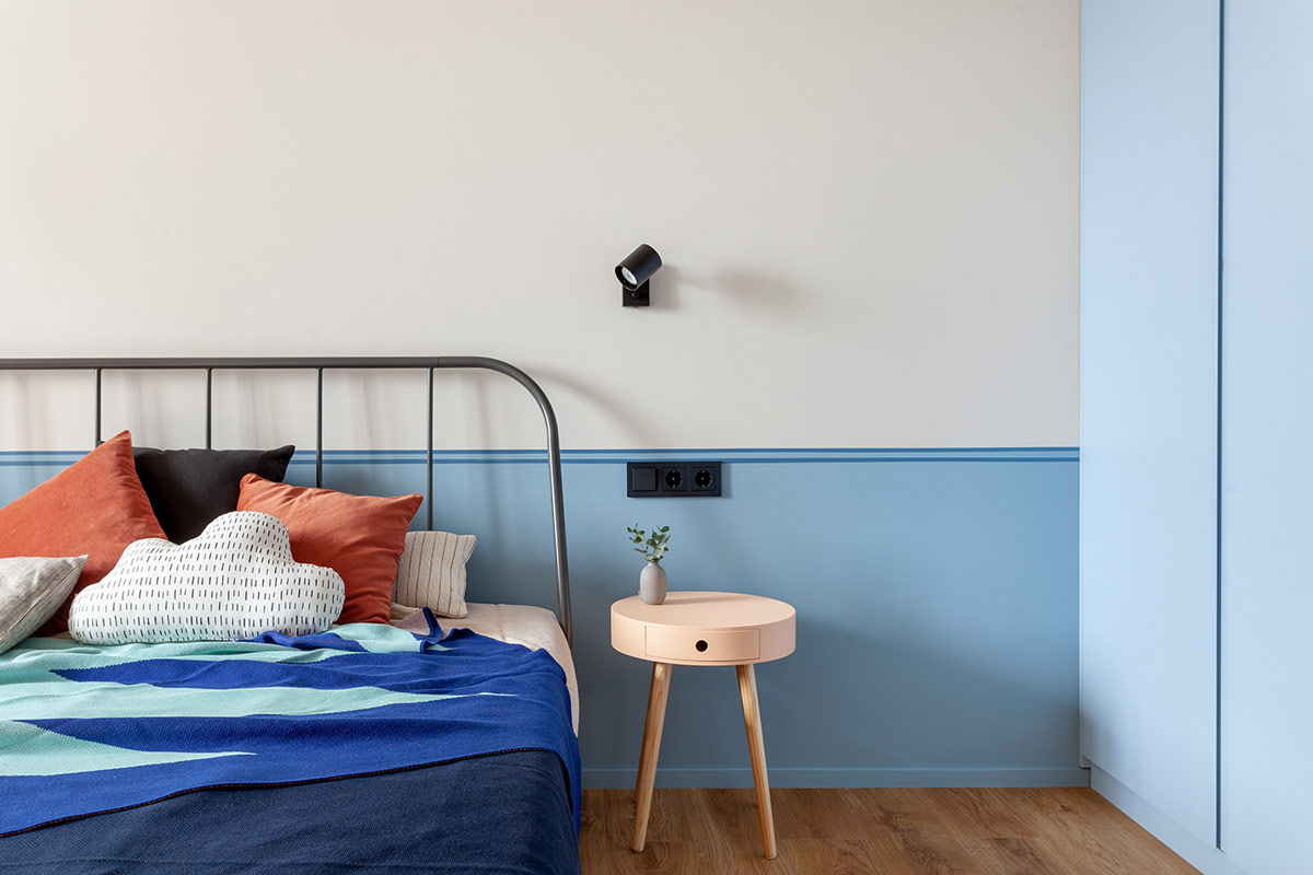 在臥室內,一條天藍色的水平色塊將明亮的圖案裝飾方案結合在一起。