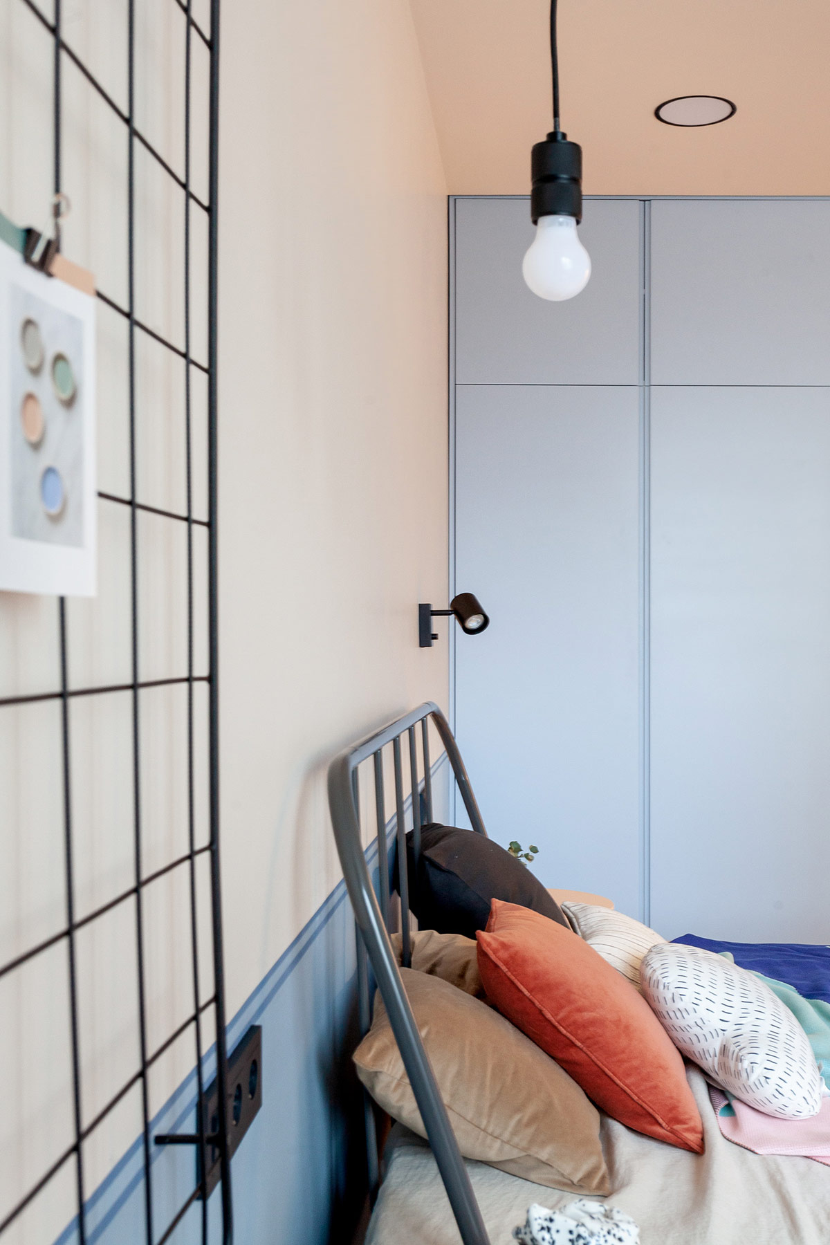 Scandi 風格的床頭柜在藍色色塊面板前呈現(xiàn)出淺紅色。合身的衣柜將藍色口音包裹在相鄰的墻壁上。