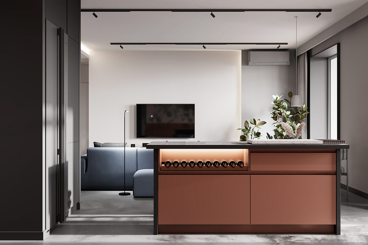葡萄酒儲藏室隱藏在中央廚房島內。
