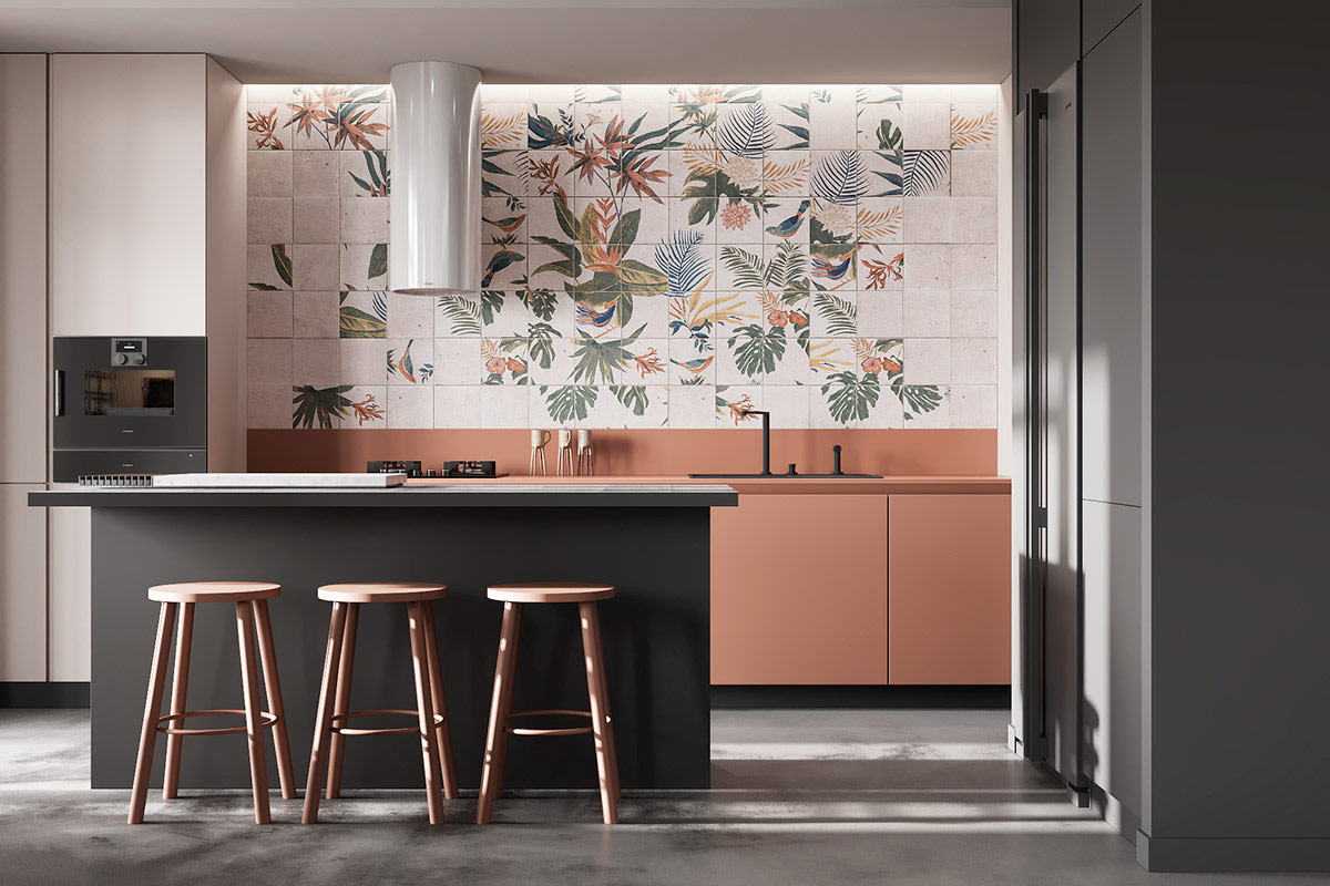 植物瓷磚在廚房的后墻上制作了一幅現(xiàn)代解構壁畫。