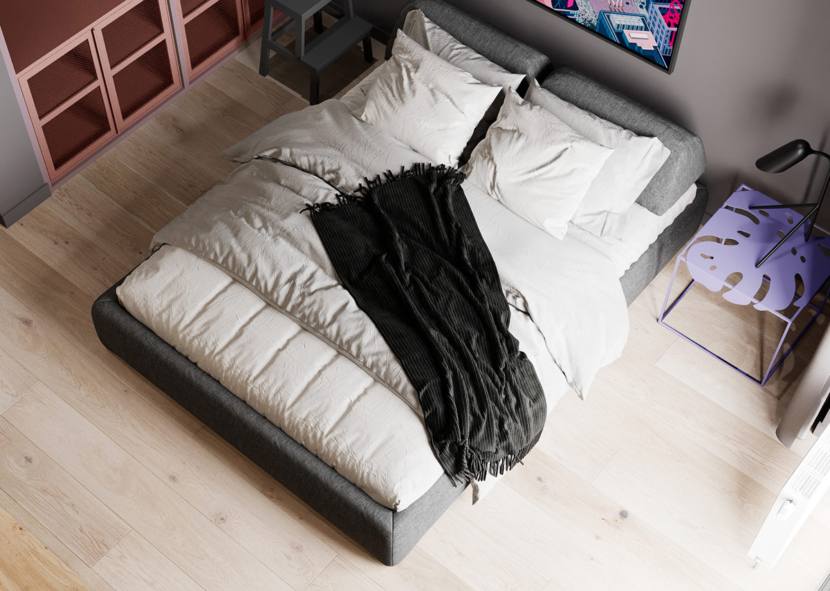 一張Monstera 圖案的邊桌在灰色軟墊床旁邊增添了一抹紫色。