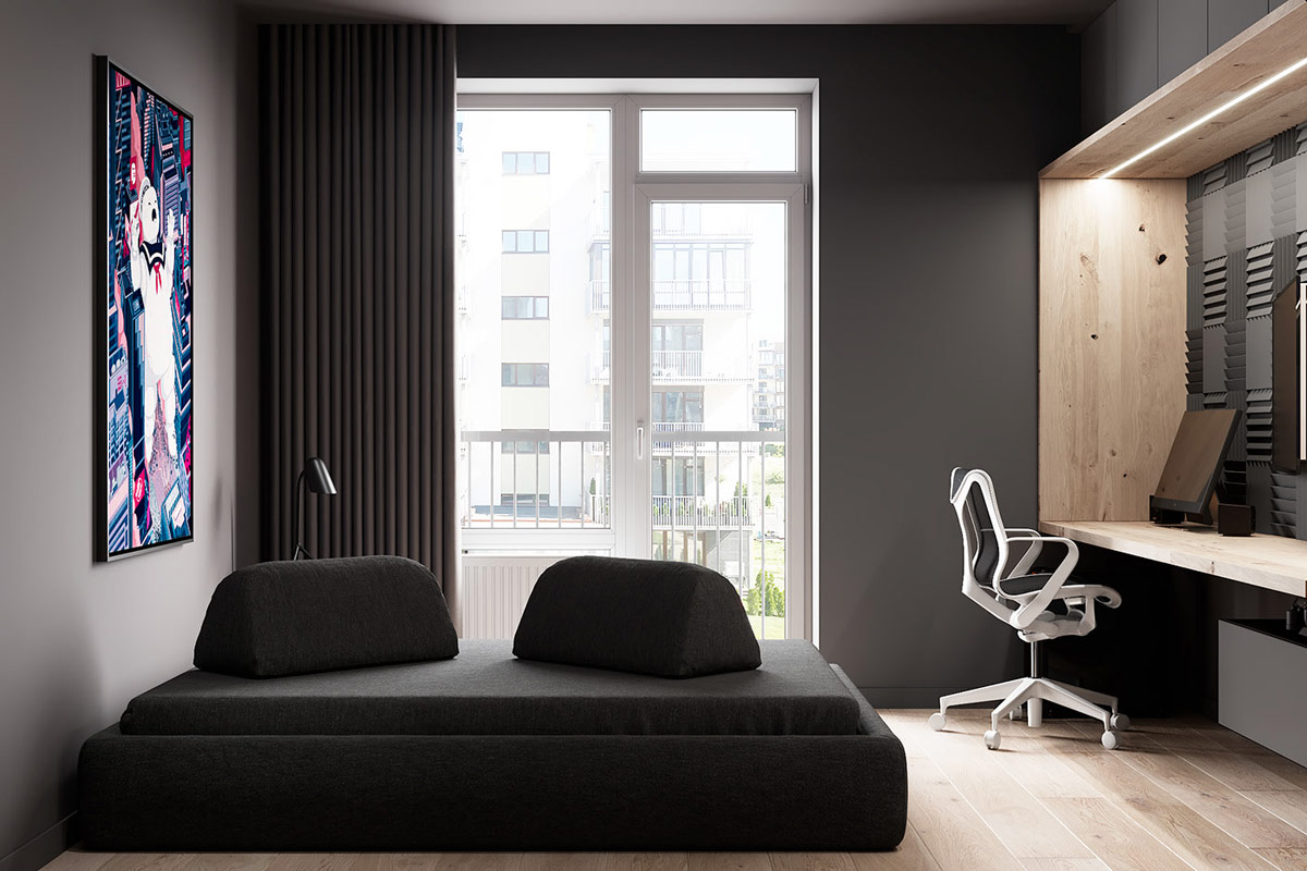 深灰色的臥室方案通過生動的口音作品充滿活力。令人敬畏的捉鬼敢死隊版畫名為City byNVM Illustration。