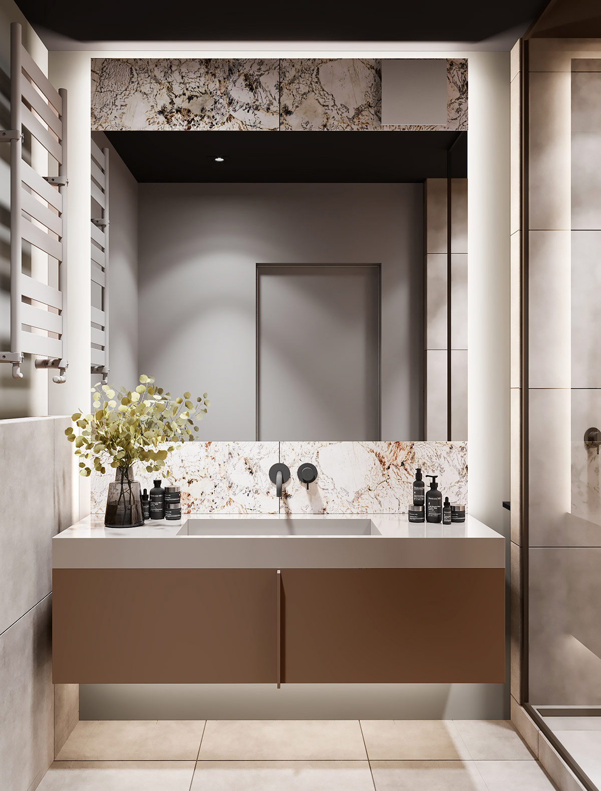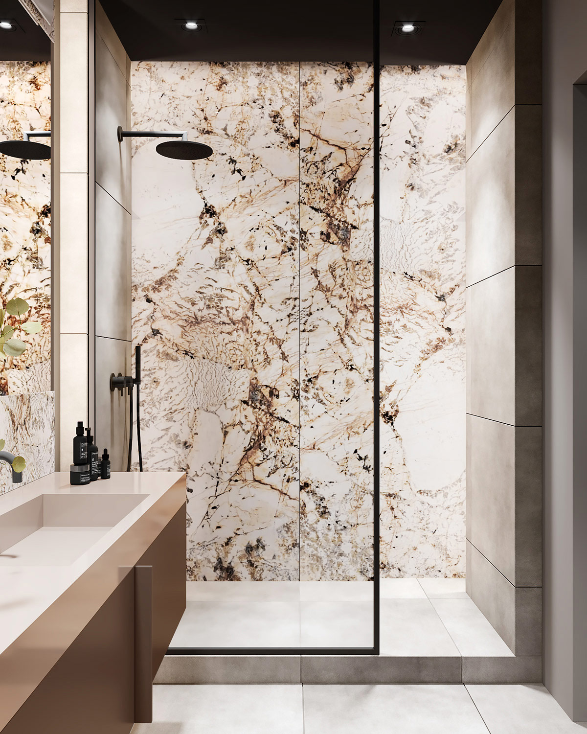 浴室融合了現(xiàn)代中性元素,配有奢華的大理石和銅色的現(xiàn)代浴室梳妝臺。