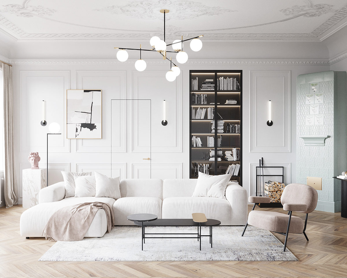 一個Maytoni懷舊 吊燈映入眼簾的,并提請注意一個美妙的原始裝飾粉刷天花板。相比之下,地板上的東西保持簡單,有柔和的地毯和清爽的白色沙發。