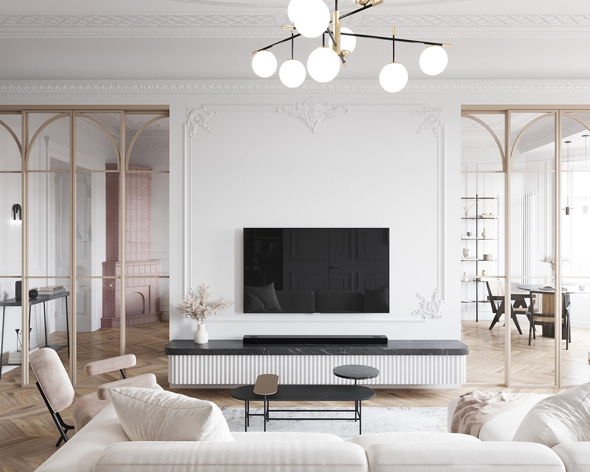 在沙發對面,一個漂浮的電視架在奢華的黑色大理石臺面下帶有時尚的羅紋美感。甲裝飾花瓶增加了一個小的高度的線性片,其與精美BOISERIE的框架連接它。電視墻兩側的玻璃門可以看到第二個休息區,里面有一個漂亮的粉紅色壁爐。