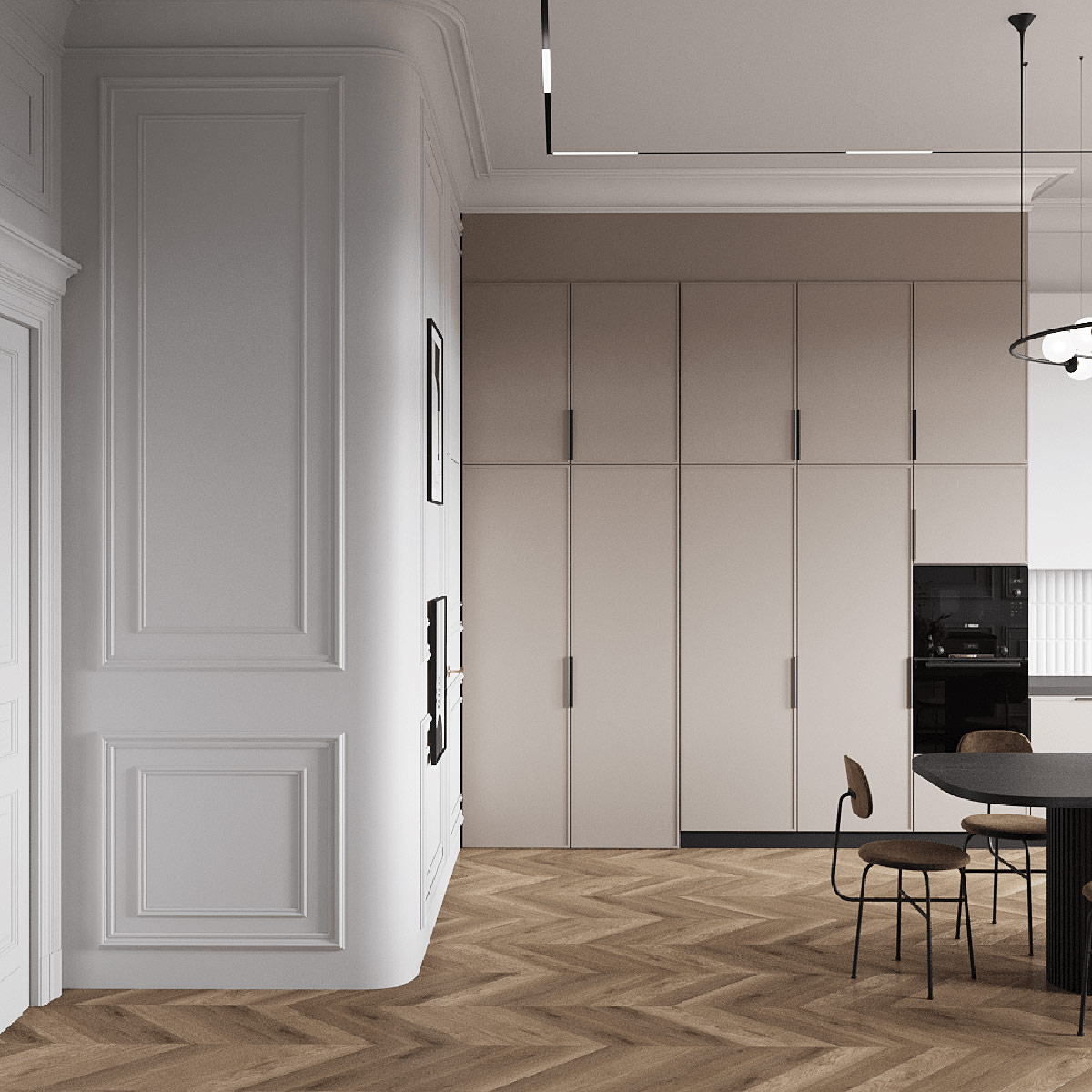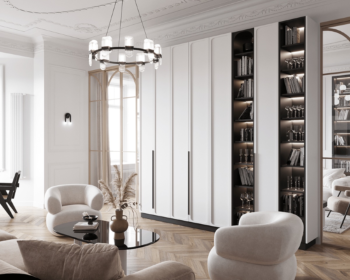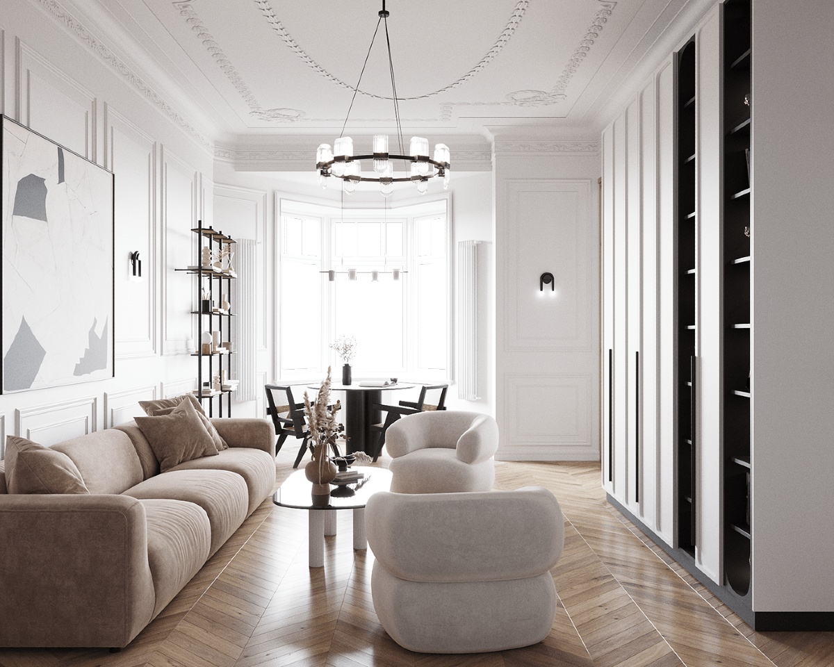 微妙的色調調色板打破了房間的崇高高度。周邊 LED 突出了經典裝飾。