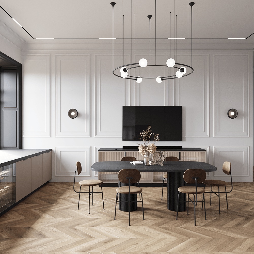 非凡的餐廳枝形吊燈在傳統壁板的背景下營造出現代感。