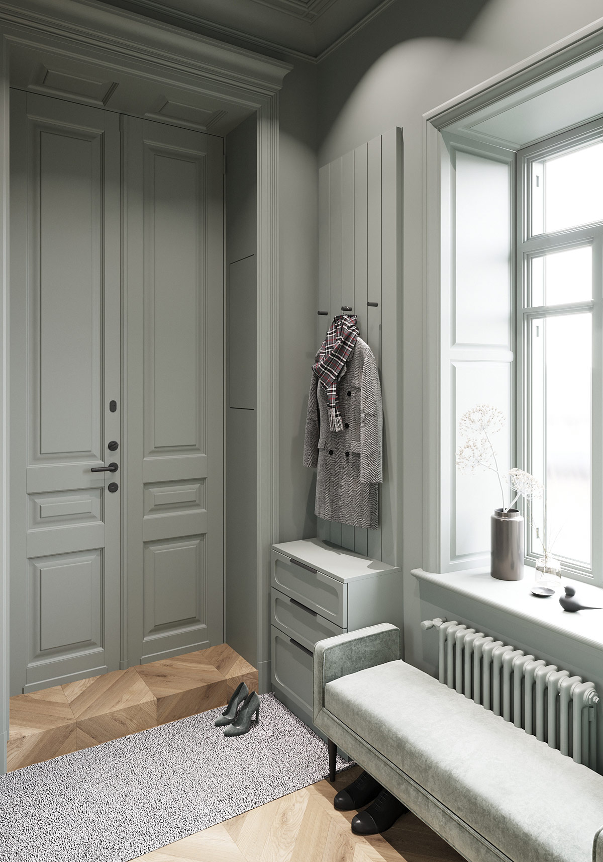 入口處是一片寧靜的鼠尾草綠色海洋,墻壁、門、家具和散熱器的油漆都完美匹配。