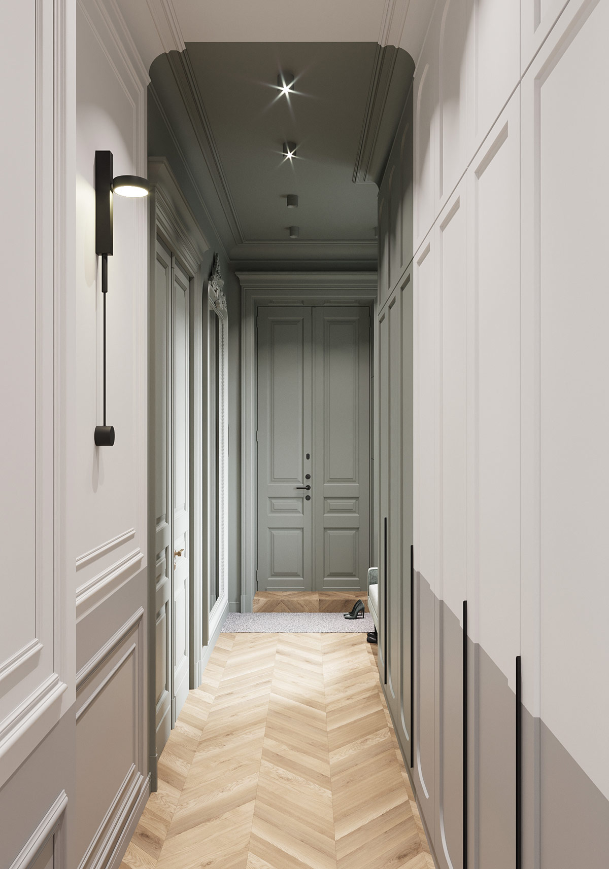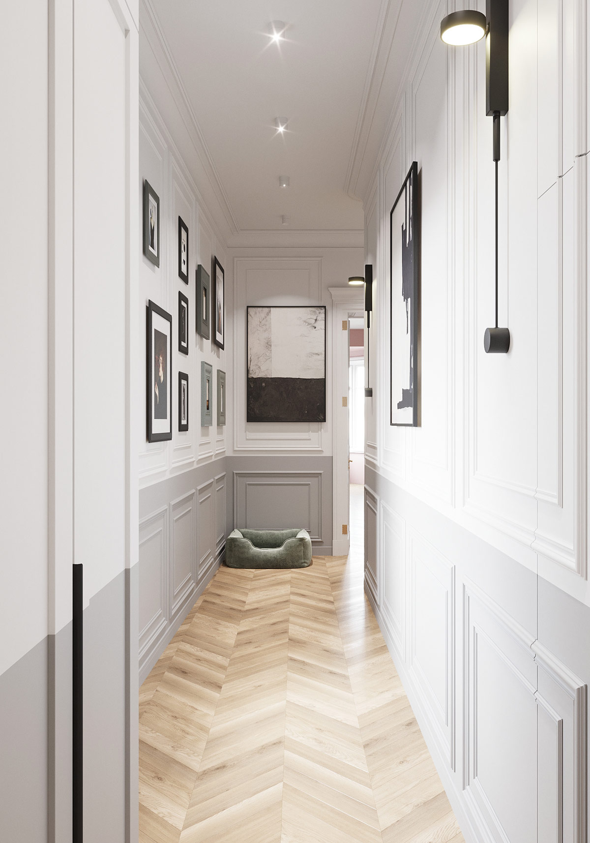半高的淺灰色油漆效果將面板模壓墻和定制存儲單元切成兩半,以打破長走廊的單調。
