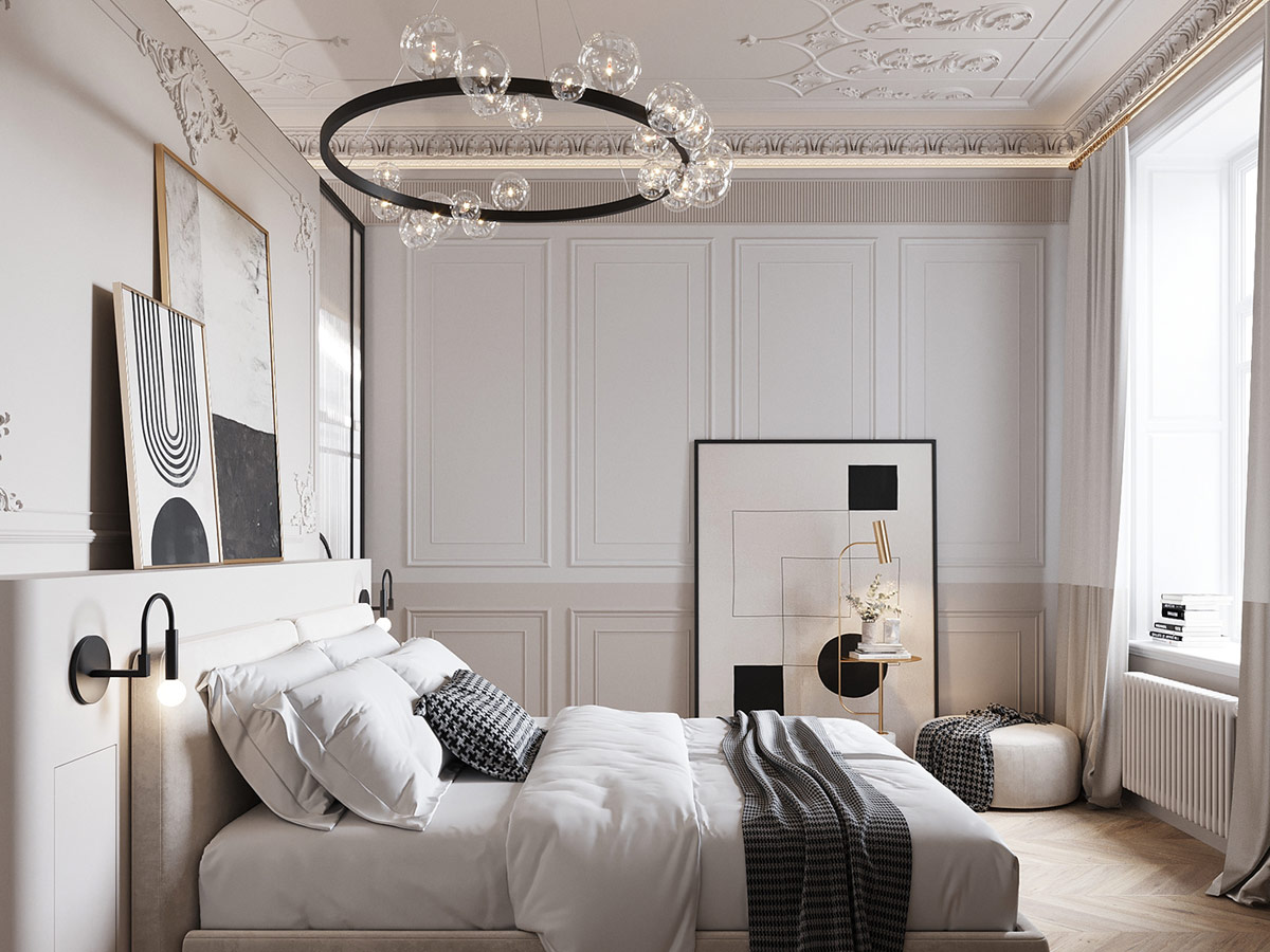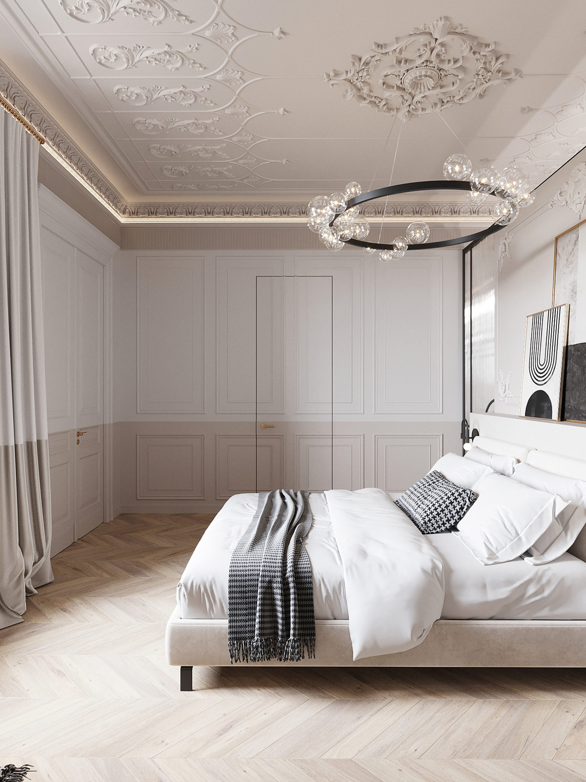 臥室是新古典主義室內設計的一個壯觀例子,擁有迷人的裝飾灰泥天花板、經典的皇冠造型和漂亮的床頭板墻。現代玻璃壁櫥門增加了令人難以置信的空間感、光線和宏偉感。
