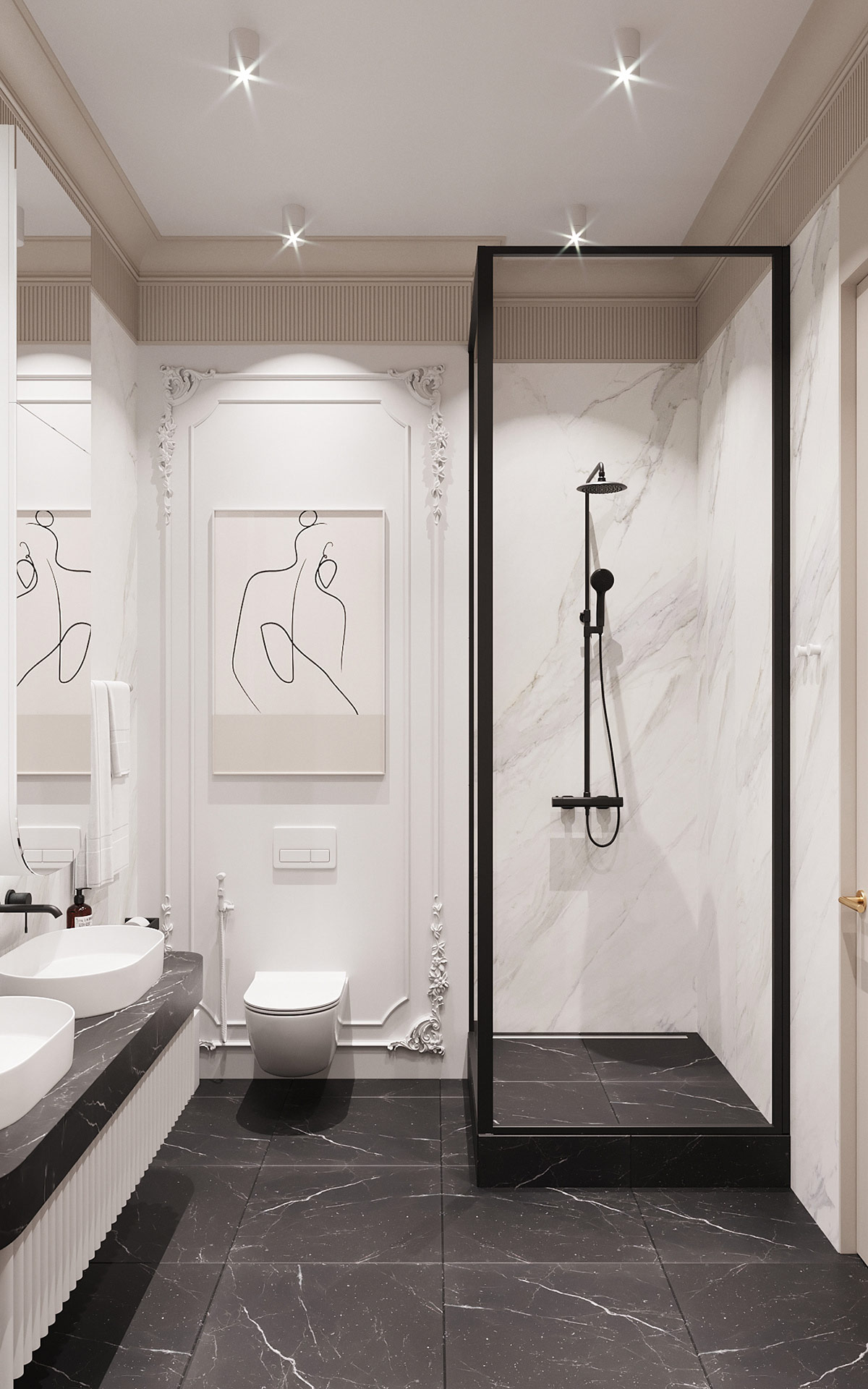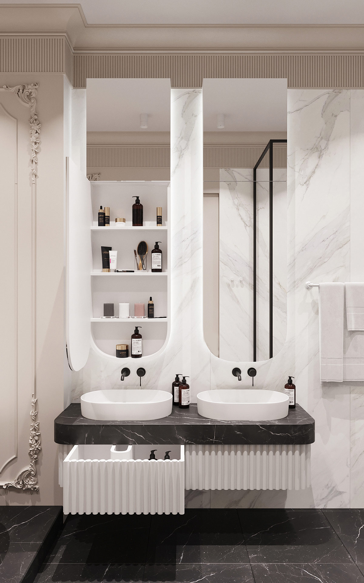 在主套間,雙水槽浴室梳妝臺采用與客廳電視柜相同的棱紋和黑色大理石美學。