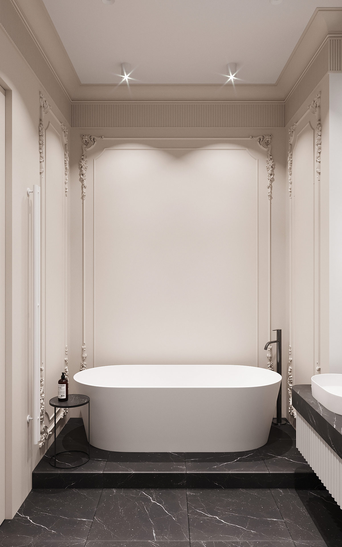 階梯式黑色大理石地板將浴缸抬高,以時尚的方式容納管道。一張黑色的小邊桌整齊地棲息在邊緣,